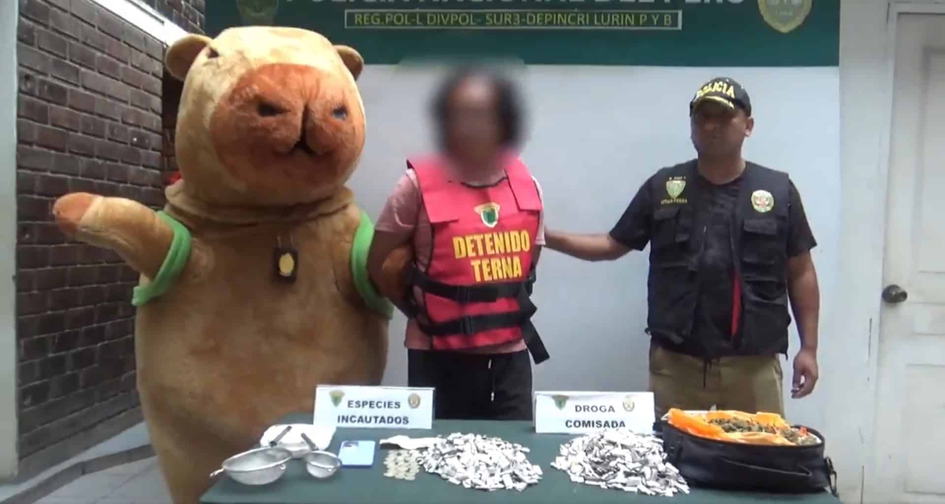 ประเด็นดังกล่าวได้รับการเปิดเผยจากกล้องบอดี้แคมของตำรวจในประเทศเปรู ซึ่งเราจะเห็นว่ามตำรวจรายหนึ่งได้สวมชุดมาสคอตคาปิบารา พร้อมกับสะพานเป้รูปเต่าที่มีสติกเกอร์รูปัวใจแปะอยู่ ก่อนที่จะทำการจับกุมชายรายหนึ่งภายในบ้านพักในเมืองลูริน ทางตอนใต้ของกรุงลิมา พร้อมกับยืดโคเคนและกัญชาได้มากกว่า 1,700 ห่อ