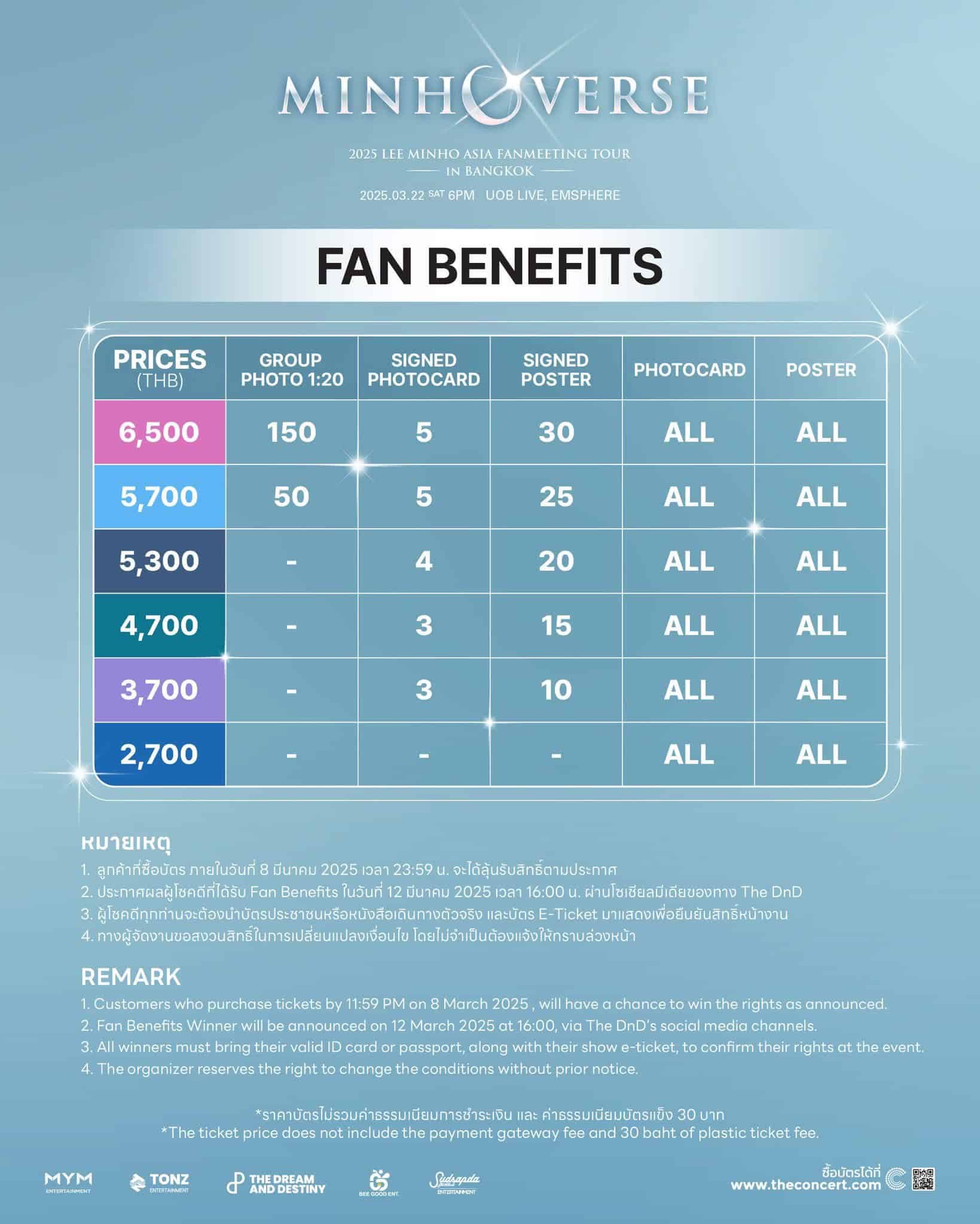 - เปิดจำหน่ายบัตร “รอบ Pre-sale” (สำหรับ MINOZ Official Fanclub) วันที่ 21 กุมภาพันธ์ 2568 เวลา 10.00 – 18.00 น. ผ่านทาง https://www.theconcert.com เท่านั้น