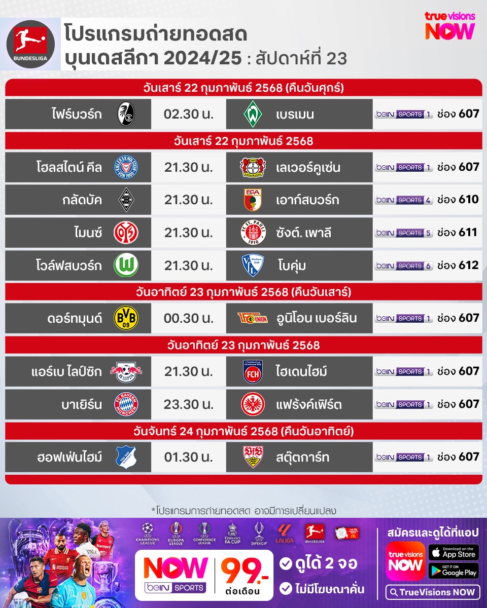 โปรแกรม บุนเดสลีกา เยอรมัน ประจำฤดูกาล 2024/25 สัปดาห์ที่ 23 ทุกคู่ ทางช่อง beIN Sports