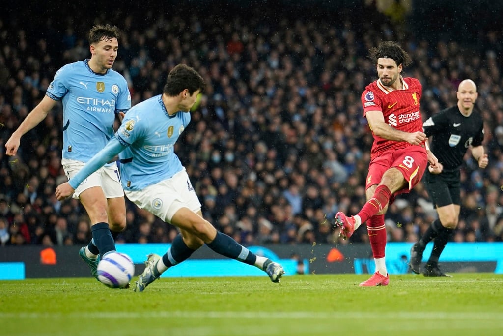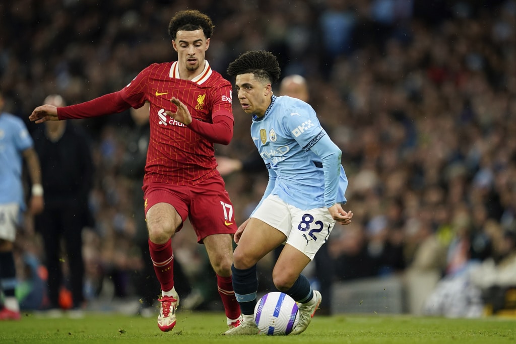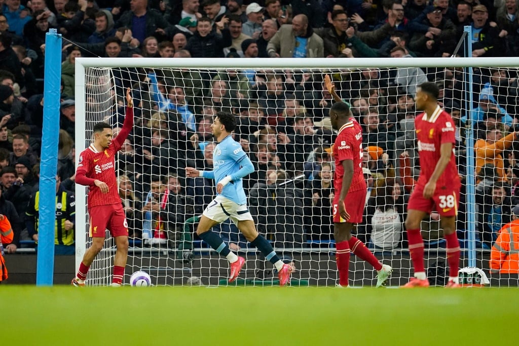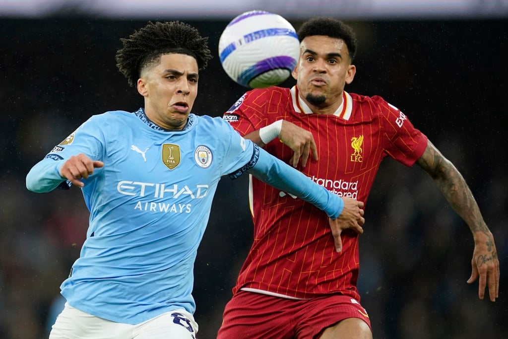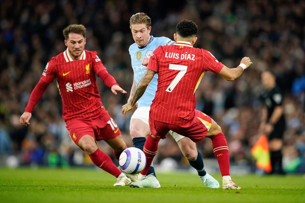 Manchester City’s Jeremy Doku, left, dribbles the ball challenged by Liverpool’s Trent Alexander-Arnold during the English Premier League soccer match between Manchester City and Liverpool at Etihad stadium in Manchester, England, Sunday, Feb. 23, 2025. (AP Photo/Dave Thompson)Manchester City’s Rico Lewis, left, and Liverpool’s Luis Diaz vie for the ball during the English Premier League soccer match between Manchester City and Liverpool at Etihad stadium in Manchester, England, Sunday, Feb. 23, 2025. (AP Photo/Dave Thompson)Liverpool’s Dominik Szoboszlai, right, scores his side’s 2nd goal during the English Premier League soccer match between Manchester City and Liverpool at Etihad stadium in Manchester, England, Sunday, Feb. 23, 2025. (AP Photo/Dave Thompson)Manchester City’s Omar Marmoush, second from left, reacts after scored a goal that was disallowed for offside during the English Premier League soccer match between Manchester City and Liverpool at Etihad stadium in Manchester, England, Sunday, Feb. 23, 2025. (AP Photo/Dave Thompson)Manchester City’s Rico Lewis, right, dribbles the ball past Liverpool’s Curtis Jones during the English Premier League soccer match between Manchester City and Liverpool at Etihad stadium in Manchester, England, Sunday, Feb. 23, 2025. (AP Photo/Dave Thompson)Manchester City’s Kevin De Bruyne, center, vies for the ball against Liverpool’s Luis Diaz, right, and Alexis Mac Allister during the English Premier League soccer match between Manchester City and Liverpool at Etihad stadium in Manchester, England, Sunday, Feb. 23, 2025. (AP Photo/Dave Thompson)Liverpool’s Luis Diaz, right, and Manchester City’s Kevin De Bruyne compete for the ball during the English Premier League soccer match between Manchester City and Liverpool at Etihad stadium in Manchester, England, Sunday, Feb. 23, 2025. (AP Photo/Dave Thompson)