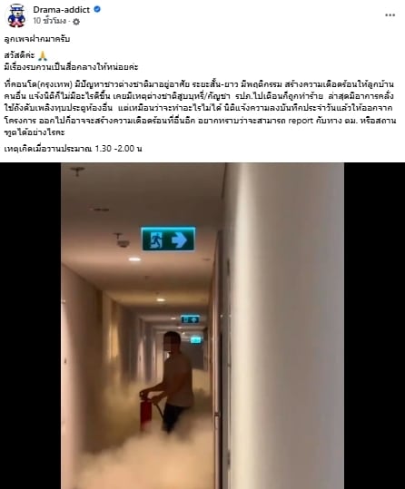 เมื่อวันที่ 21 กุมภาพันธ์ 2568 มีผู้ใช้ติ๊กต็อกรายหนึ่งโพสต์คลิปที่ถูกบันทึกได้จากหน้าห้องพักในคอนโดแห่งหนึ่ง พบชายชาวต่างชาติ เกิดอาละวาดคุ้มคลั่งใช้ถังดับเพลิงทุบประตูห้องของคนอื่น จนควันจากสารในถังดับเพลิงพวยพุ่งออกมาเต็มทางเดิน ก่อนจะเดินจากไปเหมือนไม่มีอะไรเกิดขึ้น โดยเจ้าของคลิปดังกล่าวได้ระบุแคปชั่นประกอบว่า