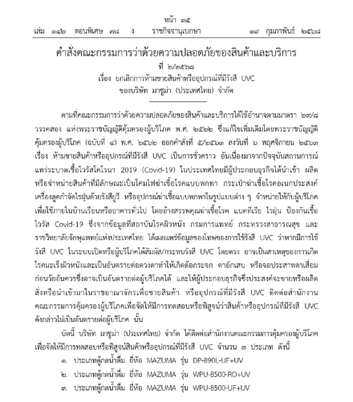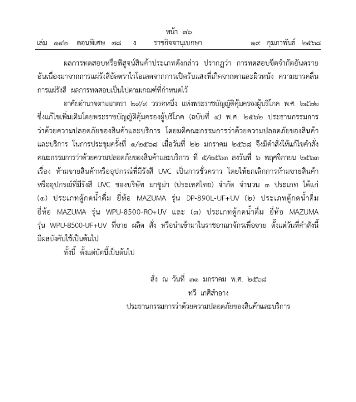อาศัยอำนาจตามมาตรา 29/9 วรรรคหนึ่ง แห่งพระราชบัญญัติคุ้มครองผู้บริโภค พ.ศ. 2522 ซึ่งแก้ไขเพิ่มเติมโดยพระราชบัญญัติคุ้มครองผู้บริโภค (ฉบับที่ 4) พ.ศ. 2562 ประธานกรรมการว่าด้วยความปลอดภัยของสินค้าและบริการ โดยมติคณะกรรมการว่าด้วยความปลอดภัยของสินค้าและบริการ ในการประชุมครั้งที่ 1/2568 เมื่อวันที่ 22 มกราคม 2568 จึงมีคำสั่งให้แก้ไขคำสั่งคณะกรรมการว่าด้วยความปลอดภัยของสินค้าและบริการ ที่ 5/2563 ลงวันที่ 6 พฤศจิกายน 2563 เรื่อง ห้ามขายสินค้าหรืออุปกรณ์ที่มีรังสี UVC เป็นการชั่วคราว โดยให้ยกเลิกการห้ามขายสินค้าหรืออุปกรณ์ที่มีรังสี UVC ของบริษัท มาชูม่า (ประเทศไทย) จำกัด จำนวน 3 ประเภท ได้แก่ (1) ประเภทตู้กดน้ำดื่ม ยี่ห้อ MAZUMA รุ่น DP-890L-UF+UV (2) ประเภทตู้กดน้ำดื่ม ยี่ห้อ MAZUMA รุ่น WPU-8500-RO+UV และ (3) ประเภทตู้กดน้ำดื่ม ยี่ห้อ MAZUMA รุ่น WPU-8500-UF+UV ที่ขาย ผลิต สัง หรือนำเข้ามาในราชอาณาจักรเพื่อขาย ตั้งแต่วันที่คำสั่งนี้ มีผลบังคับใช้เป็นต้นไป