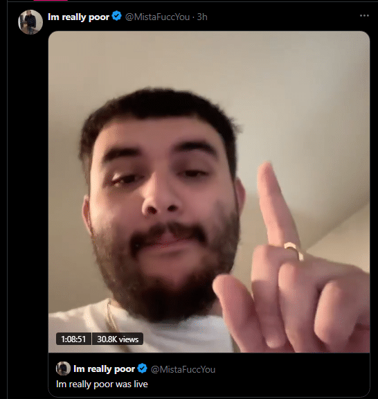 MistaFuccYou มีชื่อในโลกออนไลน์อีกชื่อว่า “Im really poor” มีอายุ 23 ปี อ้างอิงข้อมูลจากผู้ใช้งานบน X และ Reddit โพสต์ของเขาบน X แสดงให้เห็นถึงการต่อสู้กับปัญหาสุขภาพจิต และบางคนในชุมชนเชื่อว่าการฆ่าตัวตายครั้งนี้อาจเกี่ยวข้องกับการเลิกรากับแฟนด้วย เนื่องจากเขาเคยพูดถึง “คนรัก” ของเขา แต่จู่ๆ ก็หยุดพูดถึงประมาณสองสัปดาห์ก่อนเกิดเหตุ