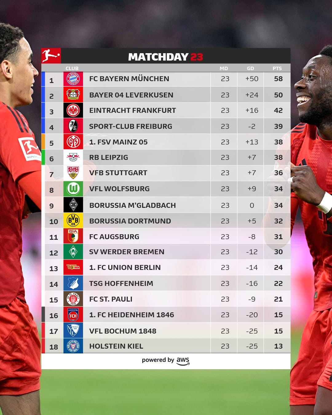 อันดับ ตารางคะแนน บุนเดสลีกา เยอรมัน 2024/25 หลังจบแมตซ์เดย์ที่ 23 โดย 5 อันดับเป็นไปตามลำดับมีดังนี้ (อัปเดตวันที่ 24 กุมภาพันธ์ 2568)
