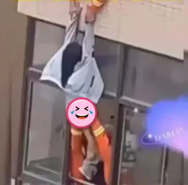 แต่เพื่อป้องกันไม่ให้ตัวเธอตกลงไป นักดับเพลิงคนดังกล่าวไม่มีทางเลือกอื่น นอกจากจับสะโพกเธอและพยุงตัวเอาไว้ จนสุดท้ายจะดึงตัวเธอกลับเข้ามาได้อย่างปลอดภัย