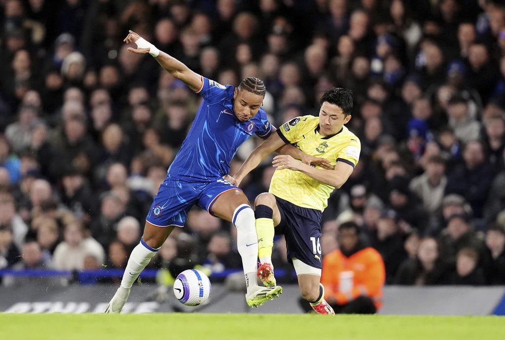 Southampton’s Yukinari Sugawara reacts after Chelsea’s Marc Cucurella scores Chelsea’s fourth goal during a Premier League soccer match, Tuesday, Feb. 25, 2025, at Stamford Bridge in London. (John Walton/PA via AP)