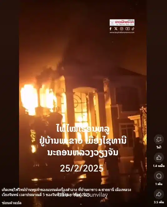 เกิดเหตุสลดขึ้นในนครเวียงจันทน์ สปป.ลาว โดยเพจเฟซบุ๊ก ໜັງສືພິມລາວພັດທະນາ Laophattana News ได้โพสต์คลิปแจ้งเหตุไฟไหม้ครั้งใหญ่ที่เกิดขึ้นในต.ชายธานี เมืองหลวงเวียงจันทน์ โดยระบุข้อความ “เกิดเหตุไฟไหม้บ้านหรู เจ้าของแบรนด์เครื่องสำอาง ที่บ้านผาขาว ต.ชายธานี เมืองหลวงนครเวียงจันทน์ เวลาประมาณตี 5 ของวันที่ 25 กุมภาพันธ์ 2025”