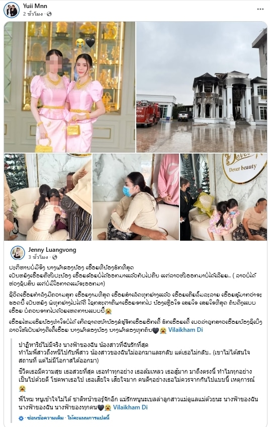 ขณะเดียวกันเจ้าของเฟซบุ๊กก็ได้แชร์โพสต์ที่มีคนร่วมไว้อาลัยต่อการจากไปของ ไฮโซสาว เจ้าของแบรนด์เครื่องสำอางชื่อดังในสปป.ลาว และเจ้าของศูนย์ความงาม DEVER BEAUTY ที่เสียชีวิตอยู่ภายในคฤหาสน์ที่ถูกไฟไหม้หลังดังกล่าว ระบุว่า