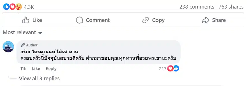 นอกจากนี้คุณหมอยังเล่าเพิ่มเติมอีกว่า “ครอบครัวนี้ปัจจุบันสบายดีครับ ฝากมาขอบคุณทุกท่านที่อวยพรเขานะครับ”