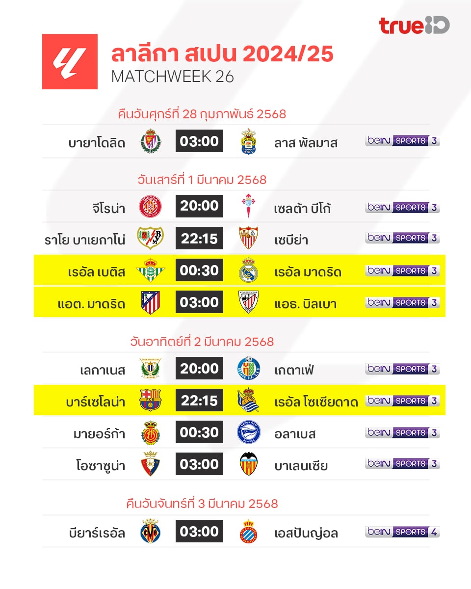 โปรแกรม ลาลีกา สเปน ประจำฤดูกาล 2024/25 สัปดาห์ที่ 26 ถ่ายทอดสดทางช่อง beIN Sport