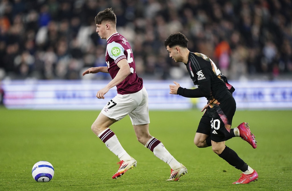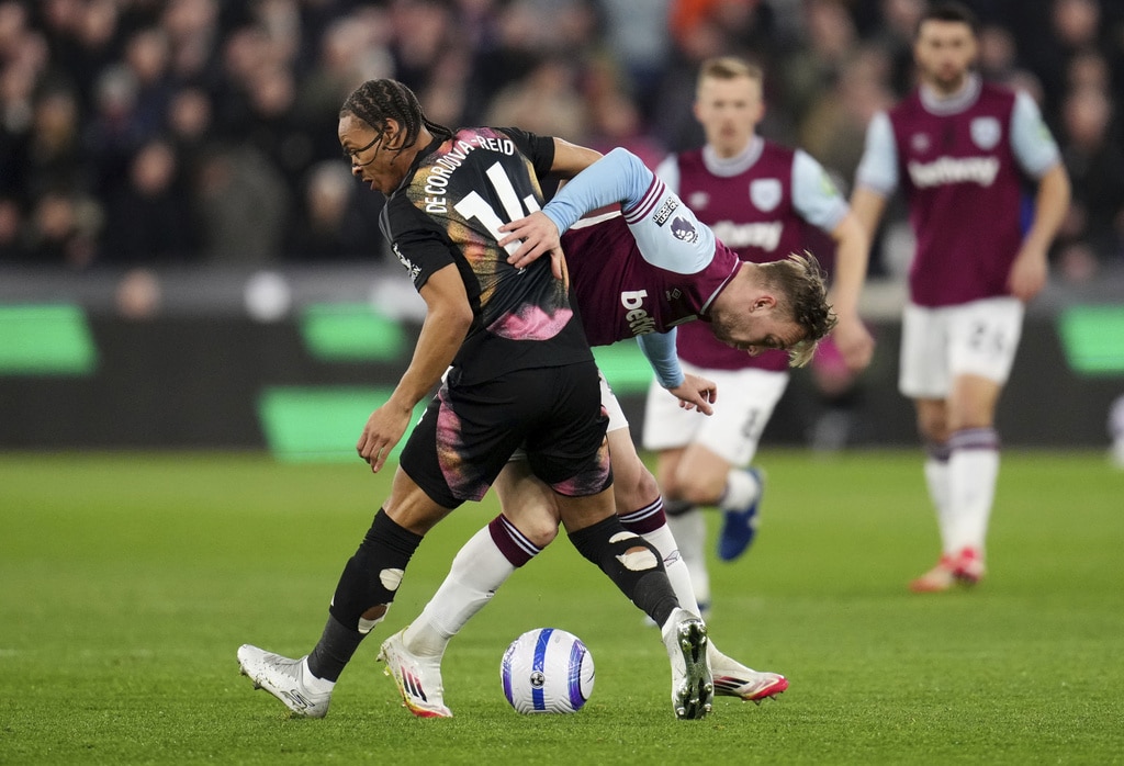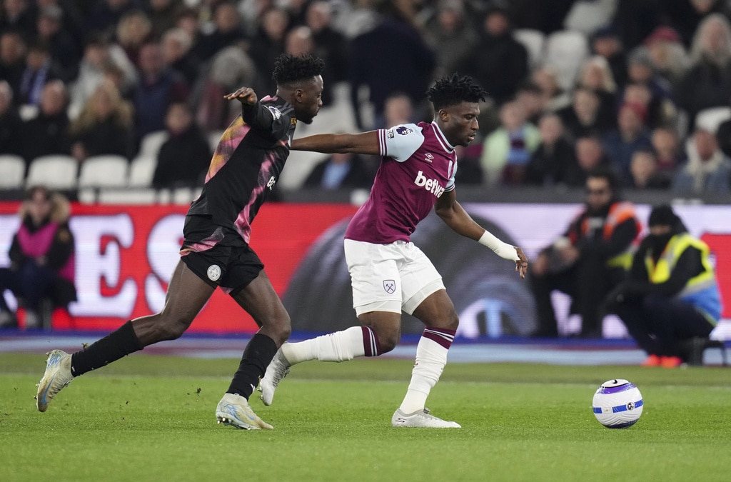 West Ham United’s Oliver Scarles, left, and Leicester City’s Facundo Buonanotte in action during the English Premier League soccer match between West Ham United and Leicester City at the London Stadium, London, Thursday Feb. 27, 2025. (Zac Goodwin/PA via AP)West Ham United’s Edson Alvarez, left, and Leicester City’s Wilfred Ndidi battle for the ball during the English Premier League soccer match between West Ham United and Leicester City at the London Stadium, London, Thursday Feb. 27, 2025. (John Walton/PA via AP)Leicester City’s Bobby Decordova-Reid, left, and West Ham United’s Jarrod Bowen in action during the English Premier League soccer match between West Ham United and Leicester City at the London Stadium, London, Thursday Feb. 27, 2025. (Zac Goodwin/PA via AP)Leicester City’s Wilfred Ndidi, left, and West Ham United’s Mohammed Kudus in action during the English Premier League soccer match between West Ham United and Leicester City at the London Stadium, London, Thursday Feb. 27, 2025. (John Walton/PA via AP)