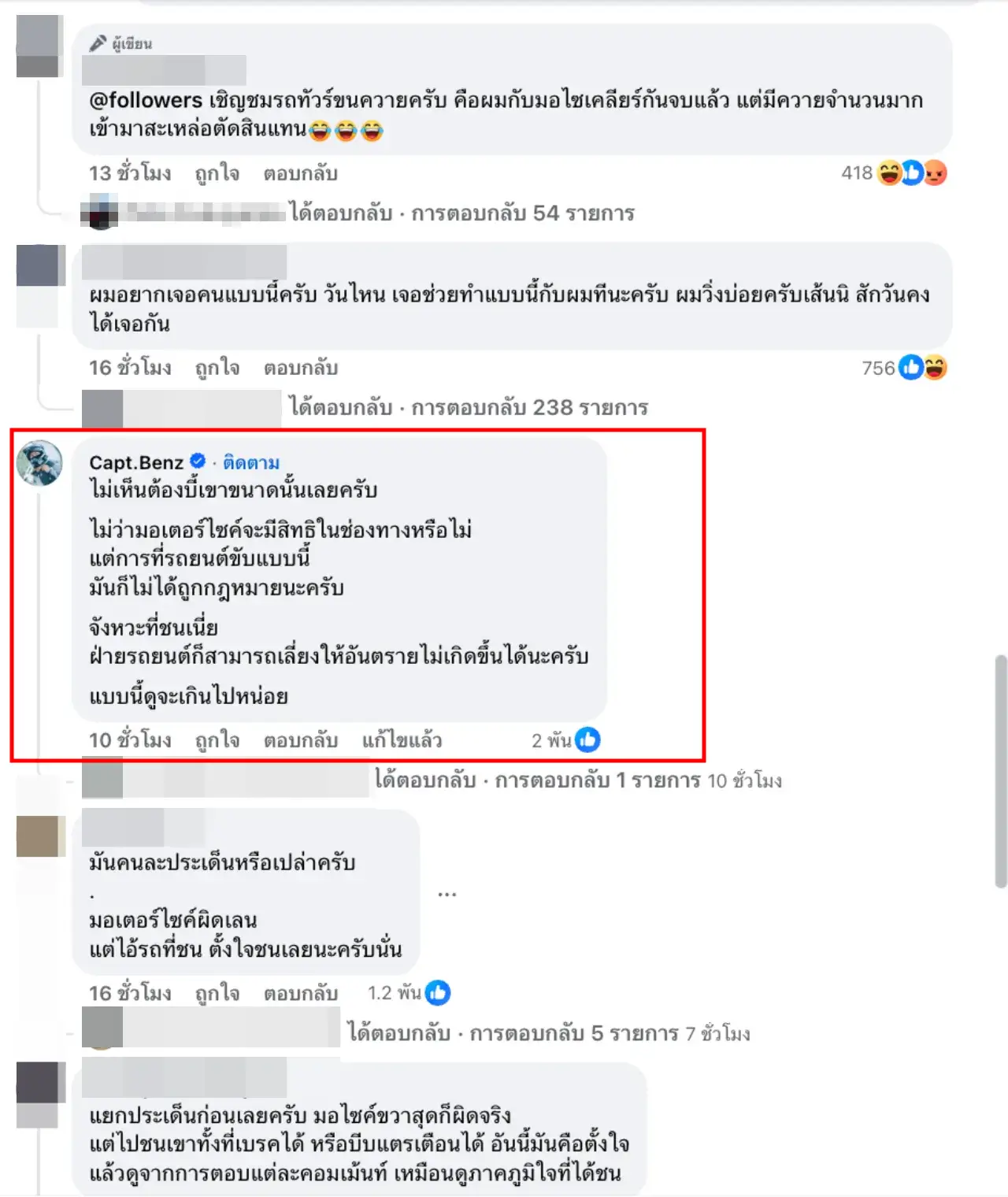 หลังจากคลิปถูกเผยแพร่ได้ไม่นาน ผู้กองเบนซ์ เจ้าของเพจ Capt.Benz ได้เข้ามาแสดงความคิดเห็นใต้โพสต์คลิปดังกล่าว ระบุว่า “ไม่เห็นต้องบี้เขาขนาดนั้นเลยครับ ไม่ว่ามอเตอร์ไซค์จะมีสิทธิในช่องทางหรือไม่ แต่การที่รถยนต์ขับแบบนี้ มันก็ไม่ได้ถูกกฎหมายนะครับ จังหวะที่ชนเนี่ย ฝ่ายรถยนต์ก็สามารถเลี่ยงให้อันตรายไม่เกิดขึ้นได้นะครับ แบบนี้ดูจะเกินไปหน่อย”