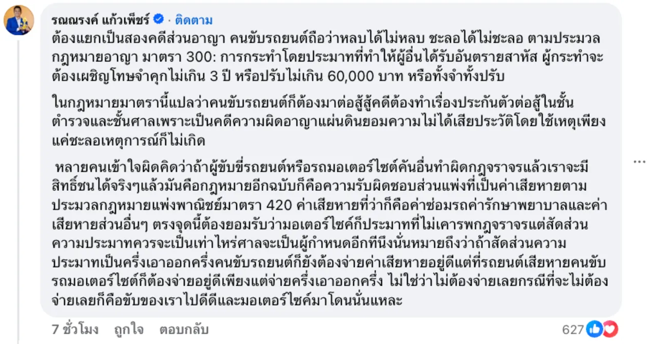 ขณะที่ทาง ทนายรณรงค์ ก็ได้ให้ความรู้เรื่องข้อกฎหมายใต้โพสต์ดังกล่าวเช่นกัน โดยระบุข้อความว่า “ต้องแยกเป็นสองคดีส่วนอาญา คนขับรถยนต์ถือว่าหลบได้ไม่หลบ ชะลอได้ไม่ชะลอ ตามประมวลกฎหมายอาญา มาตรา 300: การกระทำโดยประมาทที่ทำให้ผู้อื่นได้รับอันตรายสาหัส ผู้กระทำจะต้องเผชิญโทษจำคุกไม่เกิน 3 ปี หรือปรับไม่เกิน 60,000 บาท หรือทั้งจำทั้งปรับ