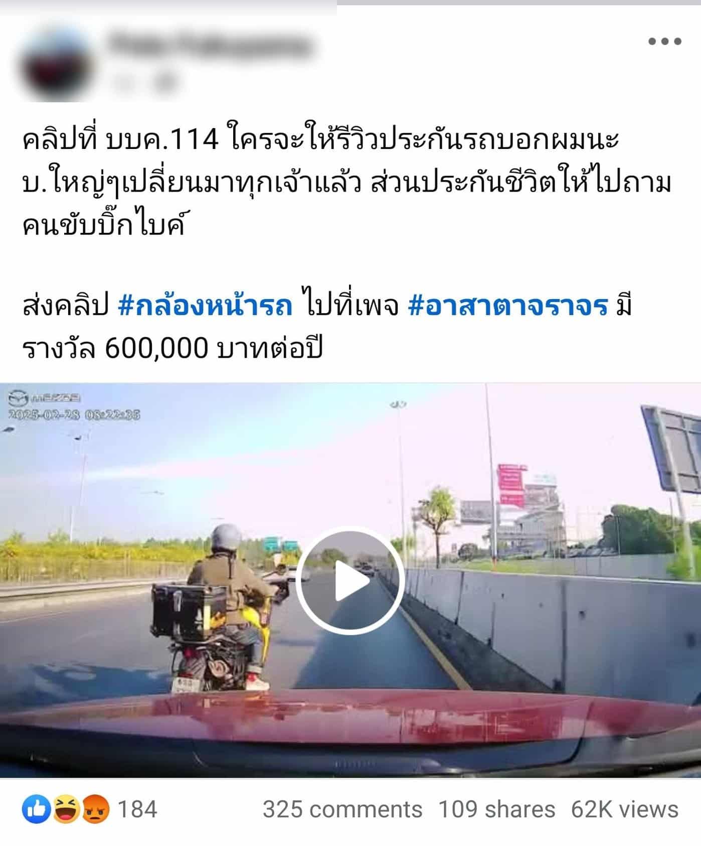 ก่อนหน้านี้โลกออนไลน์ได้มีการถกเถียงกันจ้าละหวั่นถึงคลิปจากกล้องหน้ารถเก๋ง ซึ่งถูกโพสต์ลงในหน้าเพจเฟซบุ๊กเพจหนึ่ง โดยมีแคปชั่นประกอบเอาไว้ว่า “ใครจะให้รีวิวประกันรถบอกผมนะ บ.ใหญ่ๆเปลี่ยนมาทุกเจ้าแล้ว ส่วนประกันชีวิตให้ไปถามคนขับบิ๊กไบค์”