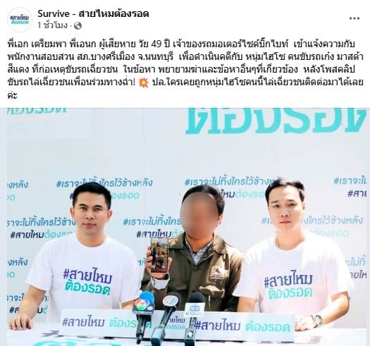 ล่าสุดทางเพจ Survive – สายไหมต้องรอด ได้ประกาศตามหาคนขับมอเตอร์ไซค์ในคลิป ก่อนจะอัปเดตว่า คนขับรถจักรยานยนต์คันดังกล่าวได้เดินทางมาหา เอก สายไหม เป็นที่เรียบร้อยแล้ว เพื่อจะเข้าแจ้งความกับเจ้าหน้าที่ตำรวจ สภ.บางศรีเมือง จ.นนทุบรี ให้ดำเนินคดีกับ หนุ่มขับรถเก๋งเฉี่ยวชน ในข้อหา พยายามฆ่า
