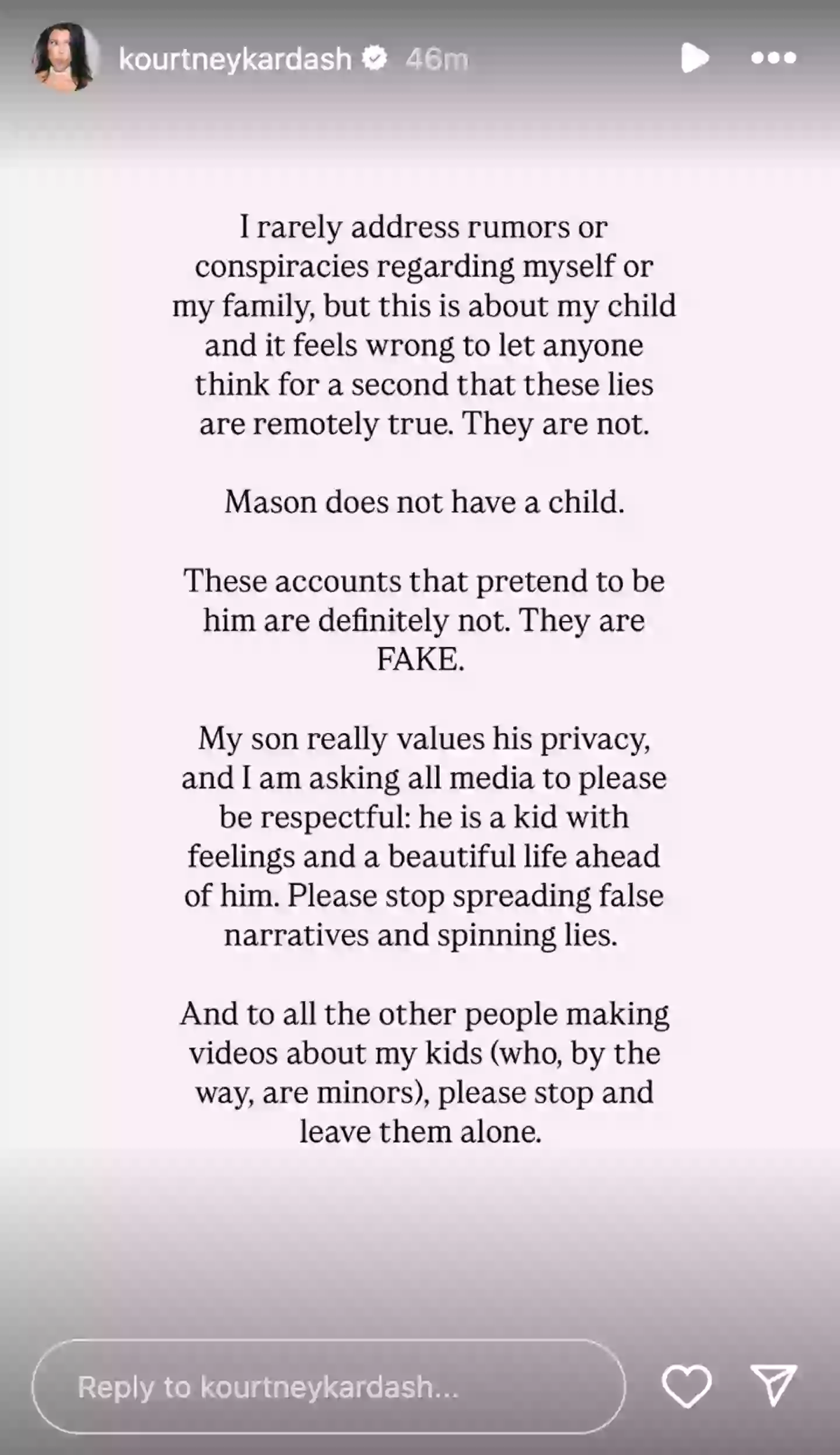 “ฉันแทบไม่เคยพูดถึงข่าวลือหรือทฤษฎีสมคบคิดเกี่ยวกับตัวฉันหรือครอบครัวของฉัน แต่เรื่องนี้เกี่ยวกับลูกของฉัน และมันรู้สึกไม่ถูกต้องที่จะปล่อยให้ใครสักคนคิดแม้แต่วินาทีเดียวว่าคำโกหกเหล่านี้เป็นความจริง มันไม่ใช่ความจริง เมสันไม่ได้มีลูก”