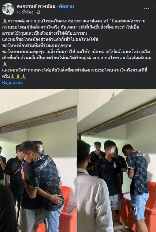 “และผมก็ขอโทษน้องส่วนตัวแล้วก็เข้าไปขอโทษโค้ช ขอโทษเพื่อนร่วมทีมที่ร่วมเล่นทุกๆคน ขอโทษแฟนบอลทุกๆท่านสิ่งที่ผมทำไป ผมได้ทำผิดพลาดไปแล้วผมหวังว่าจะไม่เกิดขึ้นกับตัวผมอีกเป็นบทเรียนให้ผมได้เรียนรู้ ต้องกราบขอโทษจากใจจริงครับผม”