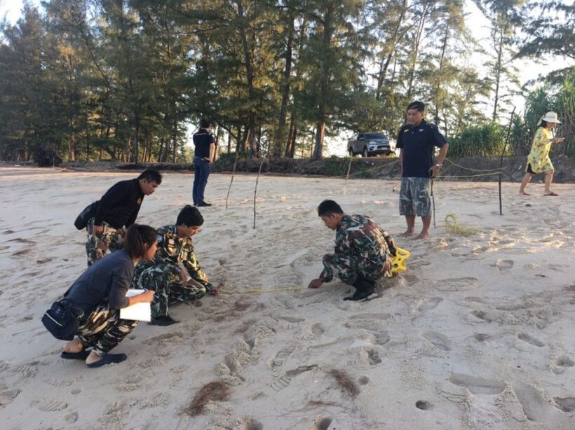 เมื่อเวลา 06.50 น. วันนี้ ( 2 ก.พ.) นายมงคล ลิ่ววิริยกุล หัวหน้าอุทยานแห่งชาติเขาลำปี-หาดท้ายเหมือง จ.พังงา ได้รับแจ้งจากราษฎร หมู่ที่ 7 บ้านในไร่ ต.นาเตย อ.ท้ายเหมือง จ.พังงา ว่า มีเต่าทะเลขึ้นวางไข่บริเวณหาดบ่อดาน (หินช้าง) ไปทางทิศใต้ประมาณ 200 เมตร จึงได้ประสานงานกับนายปรารพ แปลงงาน หัวหน้าศูนย์ปฏิบัติการอุทยานแห่งชาติทางทะเลที่ 2 จังหวัดภูเก็ต ผู้อำนวยการสำนักบริหารจัดการทรัพยากรทางทะเล และชายฝั่งที่ 8 (พังงา) นายประภาส ขุนพิทักษ์ นายอำเภอท้ายเหมือง และนายกองค์การบริหารส่วนตำบลนาเตย เข้าร่วมตรวจสอบ