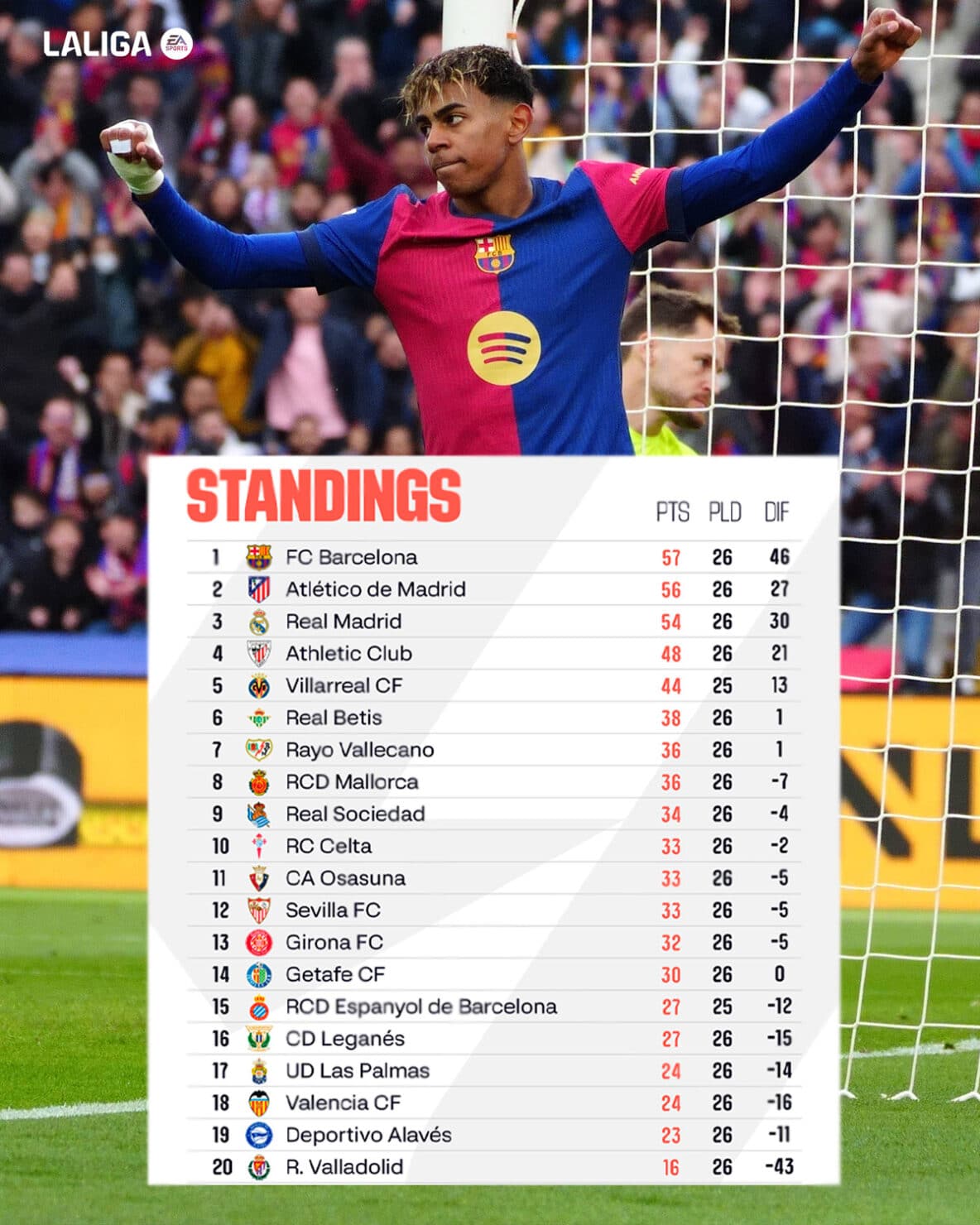สรุปผล การแข่งขัน ลาลีกา สเปน 2024/25 หลังจบนัดที่ 26