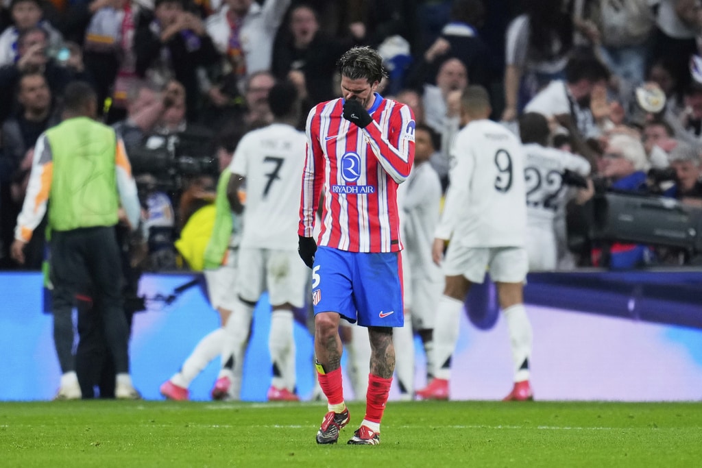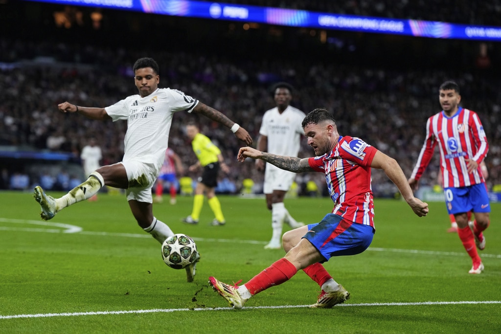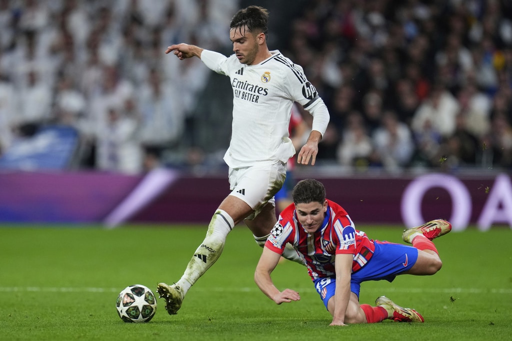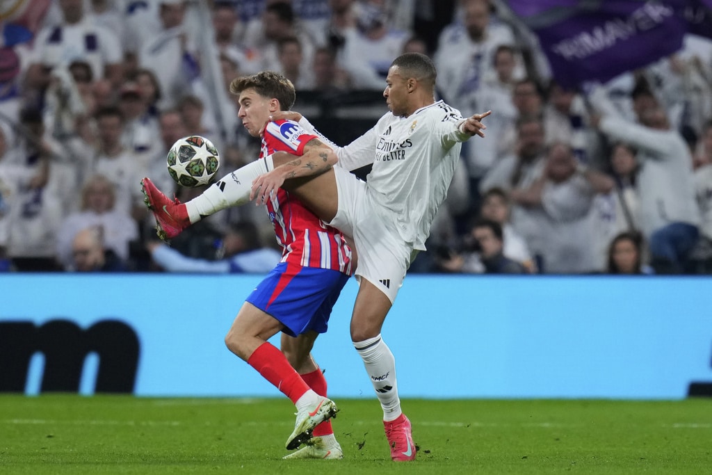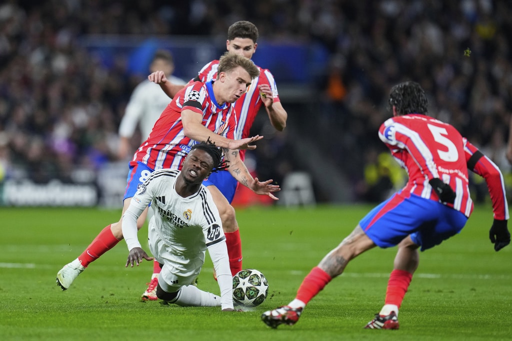 Real Madrid’s Eduardo Camavinga, bottom left, is challenged by Atletico Madrid’s Pablo Barrios, left, and Atletico Madrid’s Rodrigo De Paul, right, during the Champions League round of 16 first leg soccer match between Real Madrid and Atletico Madrid at the Bernebeu stadium in Madrid, Spain, Tuesday, March 4, 2025. (AP Photo/Manu Fernandez)Real Madrid’s goalkeeper Thibaut Courtois applauds fans at the end of the Champions League round of 16 first leg soccer match between Real Madrid and Atletico Madrid at the Bernebeu stadium in Madrid, Spain, Tuesday, March 4, 2025. (AP Photo/Manu Fernandez)Atletico Madrid’s Javi Galan, center, passes the ball past Real Madrid’s Rodrygo during the Champions League round of 16 first leg soccer match between Real Madrid and Atletico Madrid at the Bernebeu stadium in Madrid, Spain, Tuesday, March 4, 2025. (AP Photo/Manu Fernandez)Atletico Madrid’s Julian Alvarez, right, is challenged by Real Madrid’s Raul Asencio during the Champions League round of 16 first leg soccer match between Real Madrid and Atletico Madrid at the Bernebeu stadium in Madrid, Spain, Tuesday, March 4, 2025. (AP Photo/Manu Fernandez)Atletico Madrid’s Pablo Barrios, left, fights for the ball with Real Madrid’s Kylian Mbappe during the Champions League round of 16 first leg soccer match between Real Madrid and Atletico Madrid at the Bernebeu stadium in Madrid, Spain, Tuesday, March 4, 2025. (AP Photo/Manu Fernandez)Atletico Madrid’s Rodrigo De Paul, reacts after Real Madrid’s Brahim Diaz, scores his side’s second goal during the Champions League round of 16 first leg soccer match between Real Madrid and Atletico Madrid at the Bernebeu stadium in Madrid, Spain, Tuesday, March 4, 2025. (AP Photo/Manu Fernandez)Atletico Madrid’s Giuliano Simeone, left, fights for the ball with Real Madrid’s Vinicius Junior during the Champions League round of 16 first leg soccer match between Real Madrid and Atletico Madrid at the Bernebeu stadium in Madrid, Spain, Tuesday, March 4, 2025. (AP Photo/Manu Fernandez)