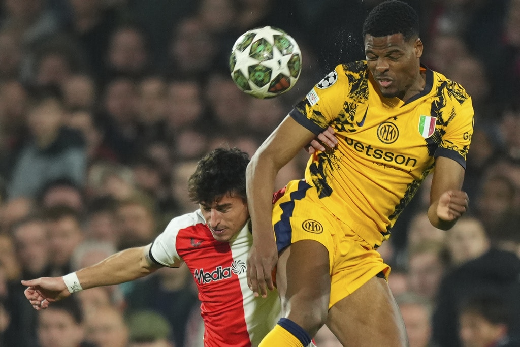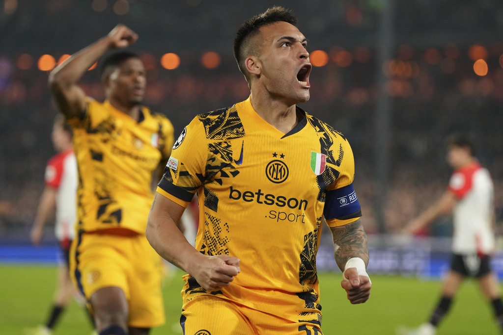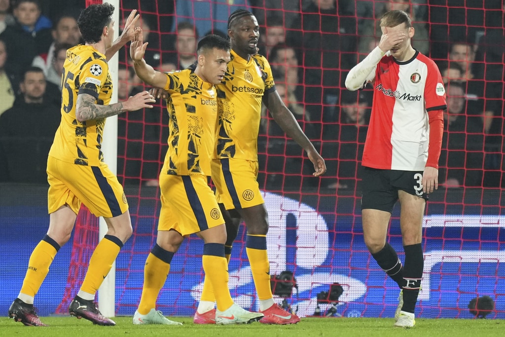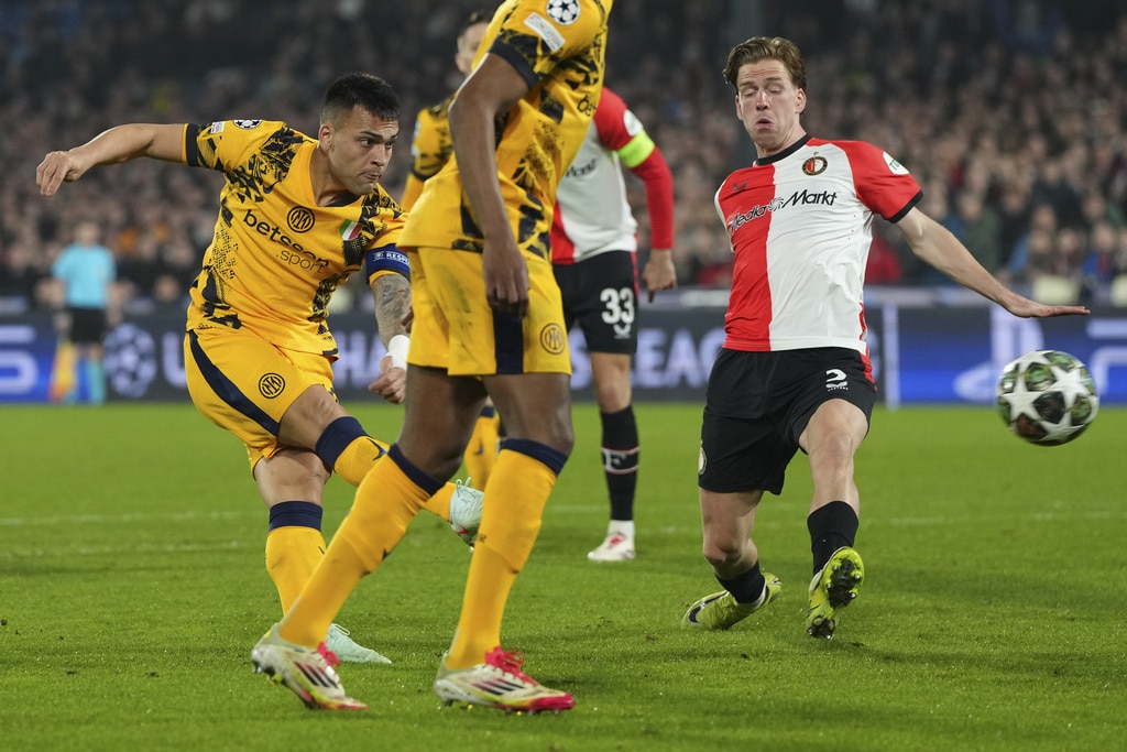 Inter Milan’s Denzel Dumfries, front, and Feyenoord’s Hugo Bueno jump for the ball during the Champions League round of 16 first leg soccer match between Feyenoord and Inter Milan in Rotterdam, Netherlands, Wednesday, March 5, 2025. (AP Photo/Peter Dejong)Inter Milan’s Marko Arnautovic, front , and Feyenoord’s Thomas Beelen fight for the ball during the Champions League round of 16 first leg soccer match between Feyenoord and Inter Milan in Rotterdam, Netherlands, Wednesday, March 5, 2025. (AP Photo/Peter Dejong)Inter Milan’s Denzel Dumfries receives the ball during the Champions League round of 16 first leg soccer match between Feyenoord and Inter Milan in Rotterdam, Netherlands, Wednesday, March 5, 2025. (AP Photo/Peter Dejong)Inter Milan’s Lautaro Martinez celebrates after scoring during the Champions League round of 16 first leg soccer match between Feyenoord and Inter Milan in Rotterdam, Netherlands, Wednesday, March 5, 2025. (AP Photo/Peter Dejong)Inter Milan’s Lautaro Martinez scores during the Champions League round of 16 first leg soccer match between Feyenoord and Inter Milan in Rotterdam, Netherlands, Wednesday, March 5, 2025. (AP Photo/Peter Dejong)Inter Milan players celebrate after a goal during the Champions League round of 16 first leg soccer match between Feyenoord and Inter Milan in Rotterdam, Netherlands, Wednesday, March 5, 2025. (AP Photo/Peter Dejong)