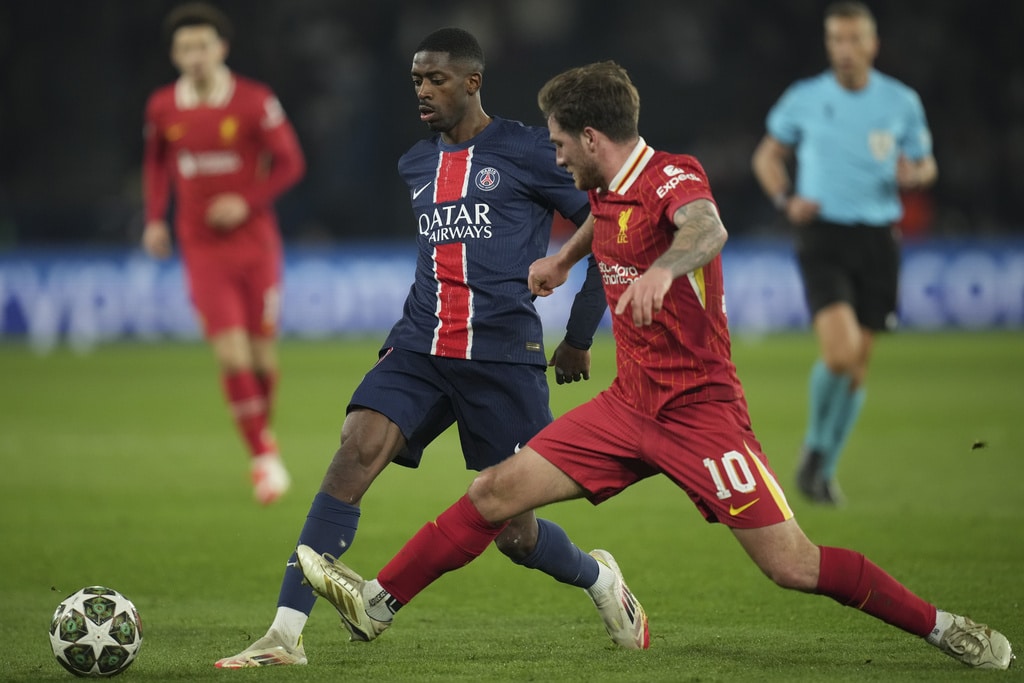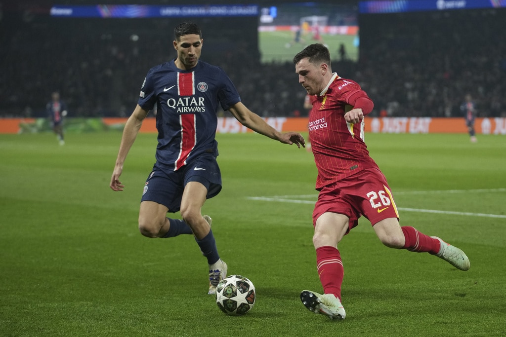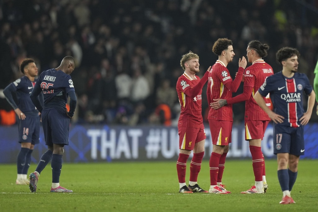 PSG’s Nuno Mendes, right, and Liverpool’s Dominik Szoboszlai battle for the ball during the Champions League round of 16 first leg soccer match between Paris Saint-Germain and Liverpool at the Parc des Princes in Paris, Wednesday, March 5, 2025. (AP Photo/Aurelien Morissard)PSG’s Willian Pacho, right, battles for the ball with Liverpool’s Mohamed Salah during the Champions League round of 16 first leg soccer match between Paris Saint-Germain and Liverpool at the Parc des Princes in Paris, Wednesday, March 5, 2025. (AP Photo/Aurelien Morissard)Liverpool’s Mohamed Salah, left, is substituted for Harvey Elliott during the Champions League round of 16 first leg soccer match between Paris Saint-Germain and Liverpool at the Parc des Princes in Paris, Wednesday, March 5, 2025. (AP Photo/Aurelien Morissard)PSG’s goalkeeper Gianluigi Donnarumma reacts after conceding the opening goal during the Champions League round of 16 first leg soccer match between Paris Saint-Germain and Liverpool at the Parc des Princes in Paris, Wednesday, March 5, 2025. (AP Photo/Aurelien Morissard)Liverpool’s Harvey Elliott, center, celebrates with teammates after the Champions League round of 16 first leg soccer match between Paris Saint-Germain and Liverpool at the Parc des Princes in Paris, Wednesday, March 5, 2025. (AP Photo/Aurelien Morissard)PSG’s Ousmane Dembele, left, and Liverpool’s Alexis Mac Allister fight for the ball during the Champions League round of 16 first leg soccer match betwen Paris Saint-Germain and Liverpool in Paris, France, Wednesday, March 5, 2025. (AP Photo/Christophe Ena)Liverpool’s Andrew Robertson sends a cross by PSG’s Achraf Hakimi during the Champions League round of 16 first leg soccer match betwen Paris Saint-Germain and Liverpool in Paris, France, Wednesday, March 5, 2025. (AP Photo/Christophe Ena)
