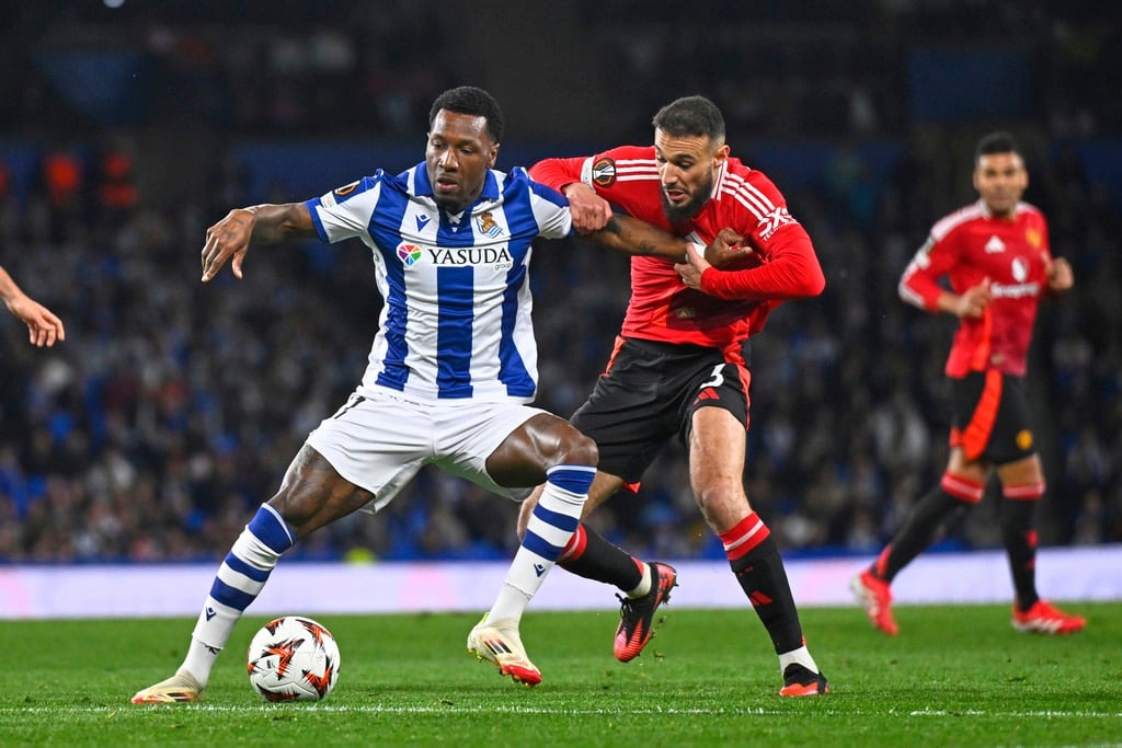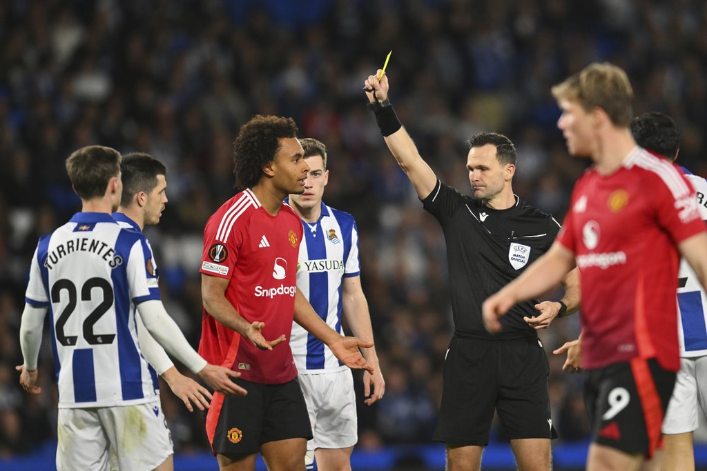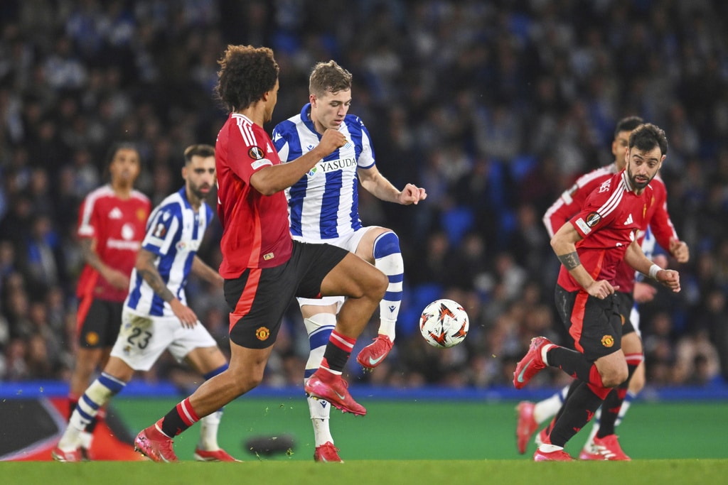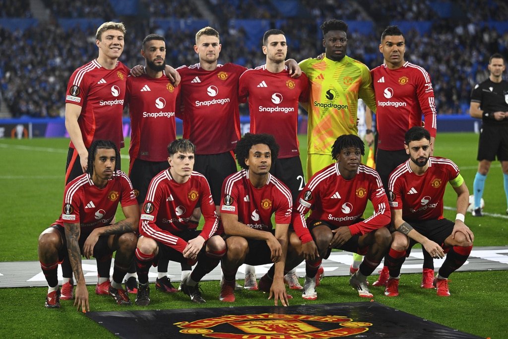 Manchester United starting players pose for a team photo at the beginning of the Europa League round of 16 first leg soccer match between Real Sociedad and Manchester United at the Reale Arena in San Sebastian, Spain, Thursday, March 6, 2025. (AP Photo/Miguel Oses)Manchester United’s Alejandro Garnacho, left, challenges for the ball with Real Sociedad’s Benat Turrientes during the Europa League round of 16 first leg soccer match between Real Sociedad and Manchester United at the Reale Arena in San Sebastian, Spain, Thursday, March 6, 2025. (AP Photo/Miguel Oses)Referee Ivan Kruzliak shows a yellow card to Real Sociedad’s Igor Zubeldia, second left, during the Europa League round of 16 first leg soccer match between Real Sociedad and Manchester United at the Reale Arena in San Sebastian, Spain, Thursday, March 6, 2025. (AP Photo/Miguel Oses)Manchester United’s Casemiro, right, reacts during the Europa League round of 16 first leg soccer match between Real Sociedad and Manchester United at the Reale Arena in San Sebastian, Spain, Thursday, March 6, 2025. (AP Photo/Miguel Oses)Real Sociedad’s Sheraldo Becker, left, challenges for the ball with Manchester United’s Noussair Mazraoui during the Europa League round of 16 first leg soccer match between Real Sociedad and Manchester United at the Reale Arena in San Sebastian, Spain, Thursday, March 6, 2025. (AP Photo/Miguel Oses)Real Sociedad’s Luka Sucic, centre, controls the ball ahead Manchester United’s Joshua Zirkzee during the Europa League round of 16 first leg soccer match between Real Sociedad and Manchester United at the Reale Arena in San Sebastian, Spain, Thursday, March 6, 2025. (AP Photo/Miguel Oses)Real Sociedad’s Jon Aramburu, left, challenges for the ball with Manchester United’s Patrick Dorgu during the Europa League round of 16 first leg soccer match between Real Sociedad and Manchester United at the Reale Arena in San Sebastian, Spain, Thursday, March 6, 2025. (AP Photo/Miguel Oses)