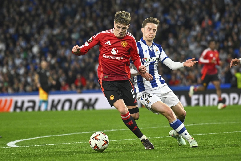 Manchester United’s Alejandro Garnacho, left, kicks the ball ahead of Real Sociedad’s Nayef Aguerd during the Europa League round of 16 first leg soccer match between Real Sociedad and Manchester United at the Reale Arena in San Sebastian, Spain, Thursday, March 6, 2025. (AP Photo/Miguel Oses)