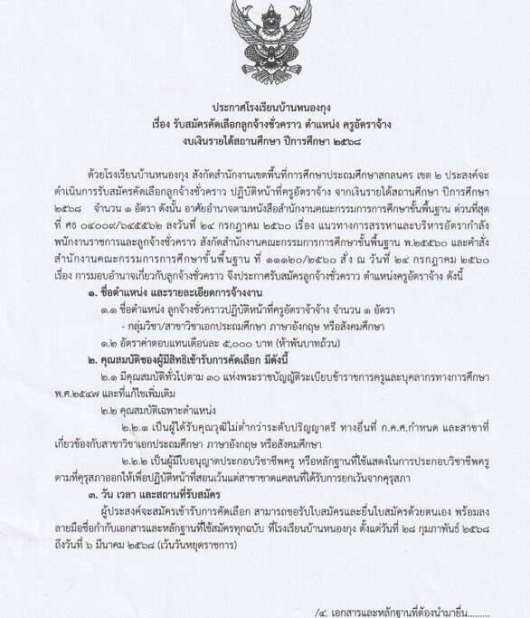 ด้วยโรงเรียนบ้านหนองกุง สังกัดสำนักงานเขตพื้นที่การศึกษาประถมศึกษาสกลนคร เขต 2 ประสงค์จะดำเนินการรับสมัครคัดเลือกลูกจ้างชั่วคราว ปฏิบัติหน้าที่ครูอัตราจ้าง จากเงินรายได้สถานศึกษา ปีการศึกษา 2568 จำนวน 1 อัตรา