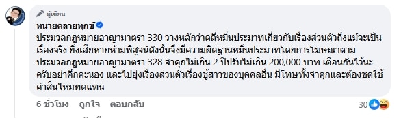 เตือนกันไว้นะครับอย่าคึกคะนอง และไปยุ่งเรื่องส่วนตัวเรื่องชู้สาวของบุคคลอื่น มีโทษทั้งจำคุกและต้องชดใช้ค่าสินไหมทดแทน”