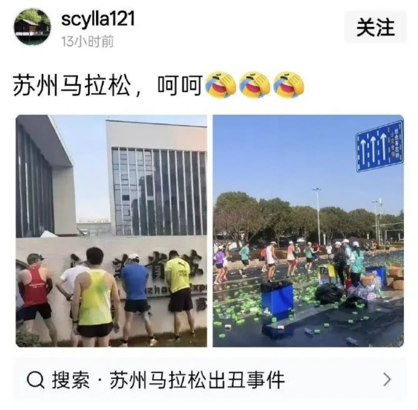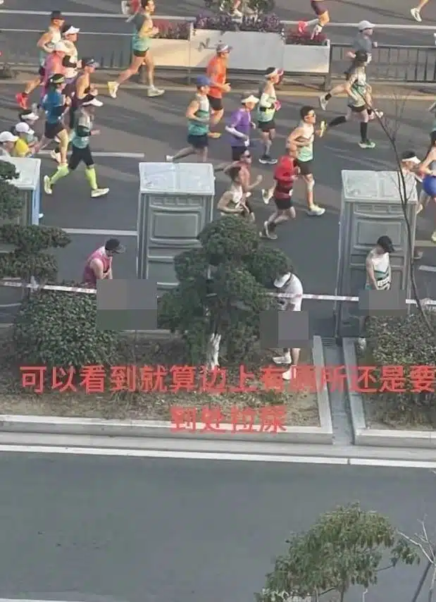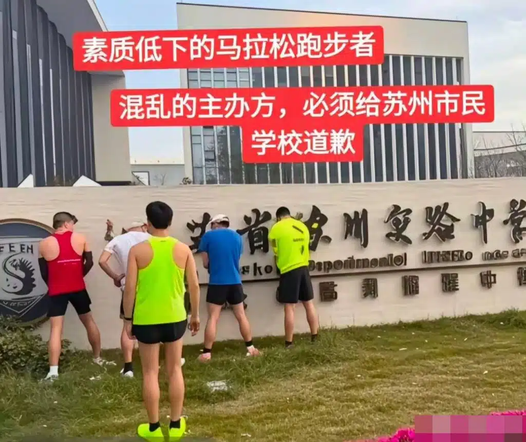 จากภาพที่เผยแพร่ในโลกออนไลน์ เผยให้เห็นนักวิ่งจำนวนมากปัสสาวะบริเวณป้ายของโรงเรียนมัธยมซูโจว ซึ่งอยู่ห่างจากห้องน้ำเคลื่อนที่ที่ทางผู้จัดงานจัดเตรียมไว้เพียงไม่กี่สิบเมตรเท่านั้น การกระทำดังกล่าวถูกมองว่าเป็นการกระทำที่ไม่ให้เกียรติสถานที่ และสะท้อนถึงการขาดความมีวินัยของนักวิ่งบางส่วน