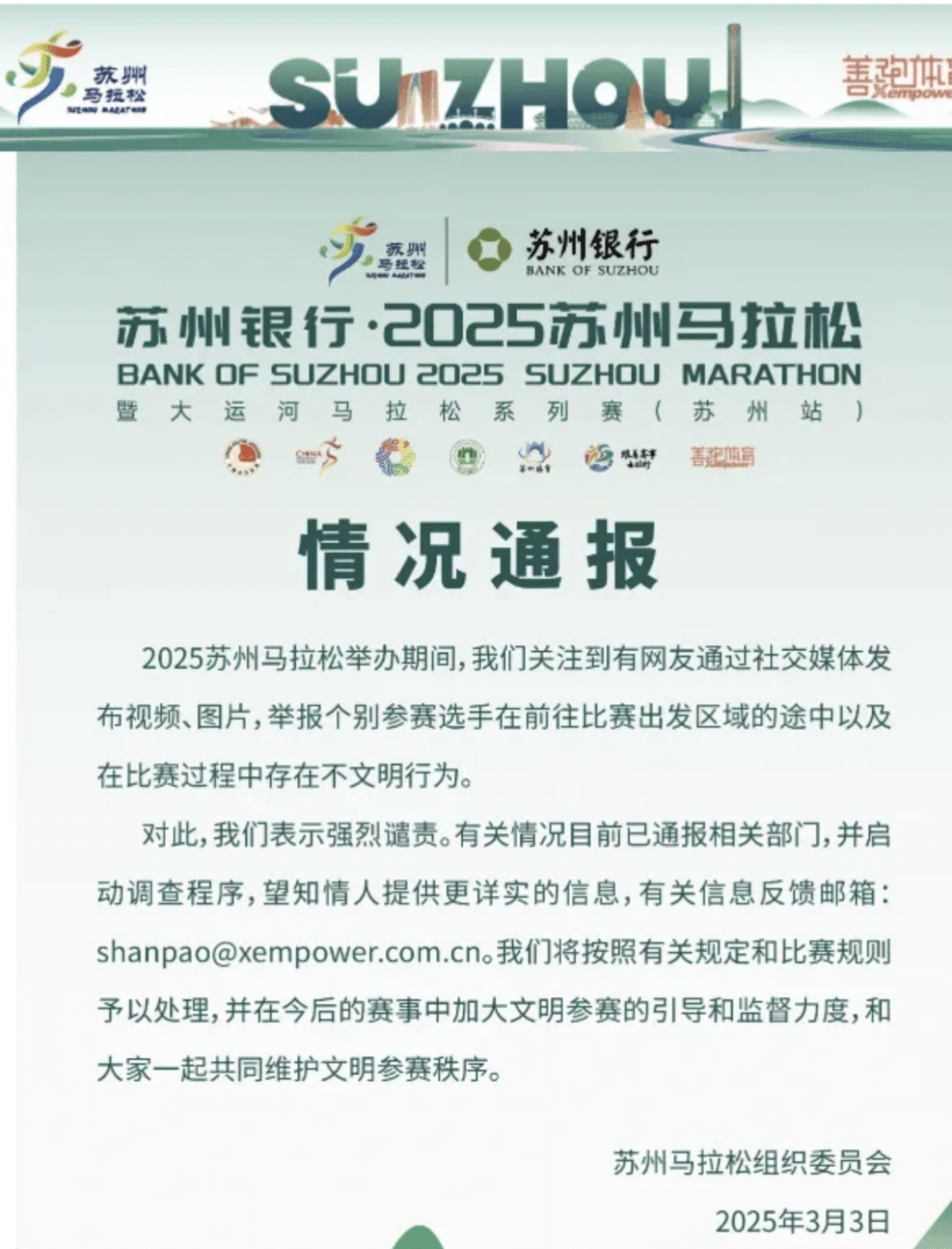 คณะกรรมการจัดการแข่งขันมาราธอนซูโจวได้ออกแถลงการณ์ประณามพฤติกรรมดังกล่าว พร้อมทั้งประกาศว่าจะดำเนินการสอบสวนและลงโทษนักวิ่งที่กระทำผิดตามกฎระเบียบของการแข่งขัน โดยอาจถึงขั้นตัดสิทธิ์การแข่งขันในปีนี้ ห้ามเข้าร่วมการแข่งขันเป็นเวลา 1-5 ปี หรือห้ามเข้าร่วมการแข่งขันตลอดชีวิต นอกจากนี้ สมาคมกรีฑาแห่งประเทศจีนยังได้ออกแถลงการณ์รณรงค์ให้นักวิ่งมีพฤติกรรมที่เหมาะสม และ “ห้ามปัสสาวะเรี่ยราด”