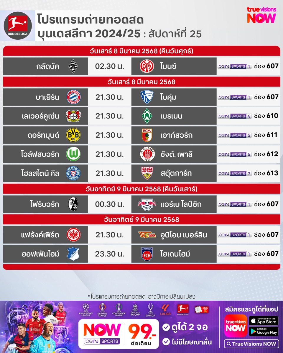 โปรแกรม บุนเดสลีกา เยอรมัน ประจำฤดูกาล 2024/25 สัปดาห์ที่ 25 ทุกคู่ ทางช่อง beIN Sports