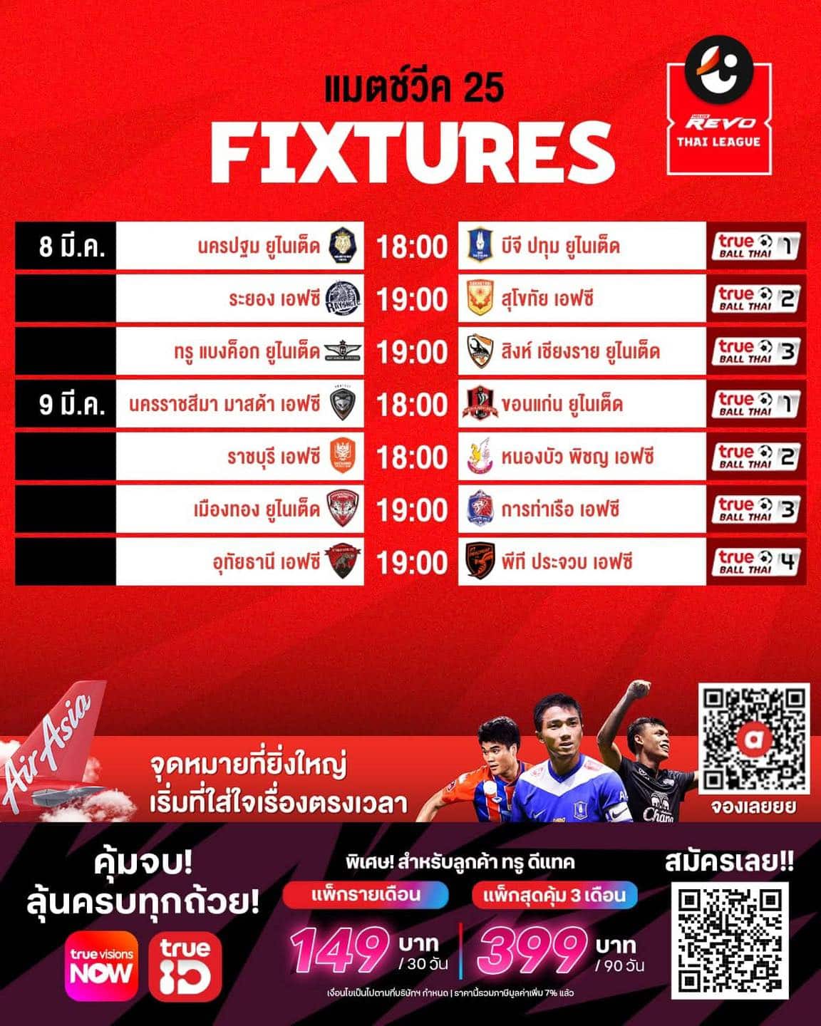 ตารางแข่งขัน รีโว่ 2024/25 ไทยลีก โปรแกรมฟุตบอลไทยลีก นัดที่ 25 ทุกคู่ถ่ายทอดสดทาง AIS Play และ True Ball Thai