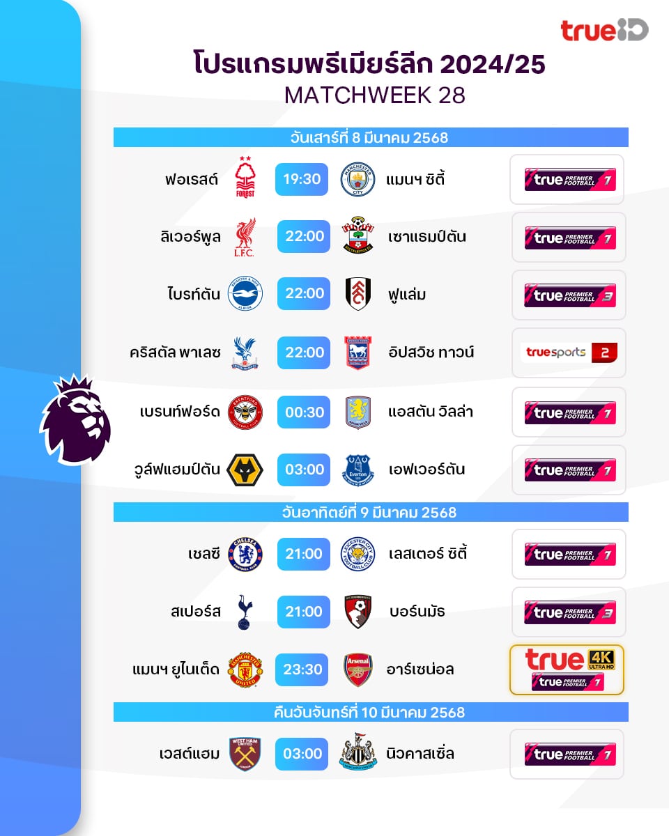 โปรแกรมพรีเมียร์ลีก 2024/25 สัปดาห์ที่ 28 แข่งวันที่ 8-9 มี.ค. นี้ ตารางแข่งพร้อมช่องดูบอลสด