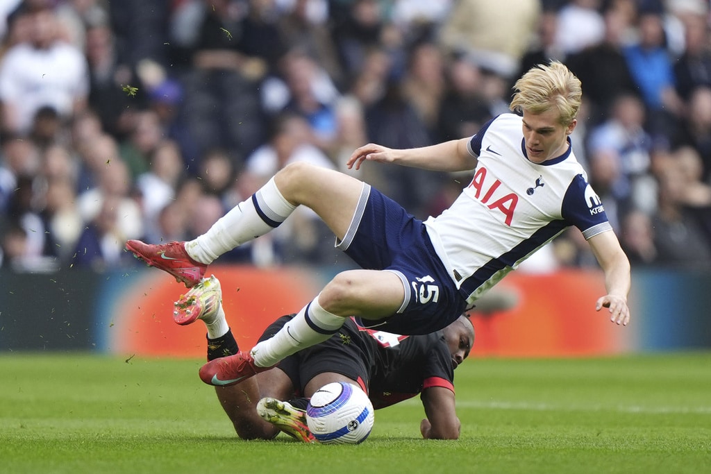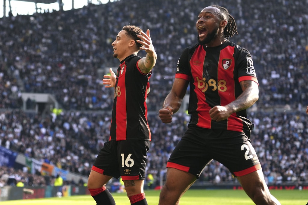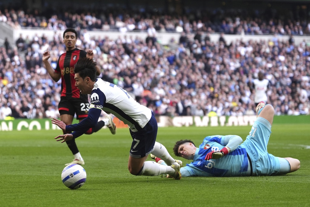 Tottenham Hotspur’s Djed Spence, left, and Bournemouth’s Evanilson battle for the ball, during the English Premier League soccer match between Tottenham Hotspur and Bournemouth, at the Tottenham Hotspur Stadium, in London, Sunday March 9, 2025. (Bradley Collyer/PA via AP)Bournemouth’s Justin Kluivert, left, and Tottenham Hotspur’s Lucas Bergvall battle for the ball during the English Premier League soccer match between Tottenham Hotspur and Bournemouth, at the Tottenham Hotspur Stadium, in London, Sunday March 9, 2025. (Bradley Collyer/PA via AP)Bournemouth goalkeeper Kepa Arrizabalaga, right, challenges Tottenham Hotspur’s Son Heung-Min which results in a penalty kick for Tottenham Hotspur, during the English Premier League soccer match between Tottenham Hotspur and Bournemouth, at the Tottenham Hotspur Stadium, in London, Sunday March 9, 2025. (Bradley Collyer/PA via AP)Tottenham Hotspur’s Lucas Bergvall is challenged for the ball by Bournemouth’s Antoine Semenyo, left, and Tyler Adams during the English Premier League soccer match between Tottenham Hotspur and Bournemouth, at the Tottenham Hotspur Stadium, in London, Sunday March 9, 2025. (Bradley Collyer/PA via AP)Tottenham Hotspur’s Lucas Bergvall, left, and Bournemouth’s Antoine Semenyo battle for the ball during the English Premier League soccer match between Tottenham Hotspur and Bournemouth, at the Tottenham Hotspur Stadium, in London, Sunday March 9, 2025. (Bradley Collyer/PA via AP)Bournemouth’s Marcus Tavernier, left, celebrates scoring his side’s first goal of the game with teammate Antoine Semenyo, during the English Premier League soccer match between Tottenham Hotspur and Bournemouth, at the Tottenham Hotspur Stadium, in London, Sunday March 9, 2025. (Bradley Collyer/PA via AP)