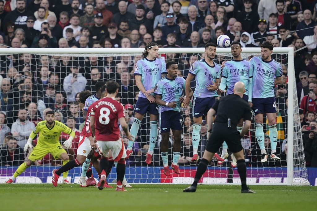 Manchester United’s Alejandro Garnacho, left, is challenged by Arsenal’s Gabriel during the English Premier League soccer match between Manchester United and Arsenal at Old Trafford stadium in Manchester, England, Sunday, March 9, 2025. (AP Photo/Dave Thompson)Manchester United’s Bruno Fernandes leaves the pitch after the English Premier League soccer match between Manchester United and Arsenal at Old Trafford stadium in Manchester, England, Sunday, March 9, 2025. (AP Photo/Dave Thompson)Arsenal’s goalkeeper David Raya, center, makes a save during the English Premier League soccer match between Manchester United and Arsenal at Old Trafford stadium in Manchester, England, Sunday, March 9, 2025. (AP Photo/Dave Thompson)Manchester United’s Ayden Heaven, center, tries control the ball past Arsenal’s Gabriel during the English Premier League soccer match between Manchester United and Arsenal at Old Trafford stadium in Manchester, England, Sunday, March 9, 2025. (AP Photo/Dave Thompson)Manchester United’s Toby Collyer, bottom, and Arsenal’s Gabriel Martinelli vie for the ball during the English Premier League soccer match between Manchester United and Arsenal at Old Trafford stadium in Manchester, England, Sunday, March 9, 2025. (AP Photo/Dave Thompson)Manchester United’s Bruno Fernandes, right, reacts after Arsenal’s Declan Rice, left, scoring his side’s first goal during the English Premier League soccer match between Manchester United and Arsenal at Old Trafford stadium in Manchester, England, Sunday, March 9, 2025. (AP Photo/Dave Thompson)Arsenal’s William Saliba, right, challenges Manchester United’s Joshua Zirkzee during the English Premier League soccer match between Manchester United and Arsenal at Old Trafford stadium in Manchester, England, Sunday, March 9, 2025. (AP Photo/Dave Thompson)Manchester United’s Bruno Fernandes (8) scores his side’s opening goal during the English Premier League soccer match between Manchester United and Arsenal at Old Trafford stadium in Manchester, England, Sunday, March 9, 2025. (AP Photo/Dave Thompson)