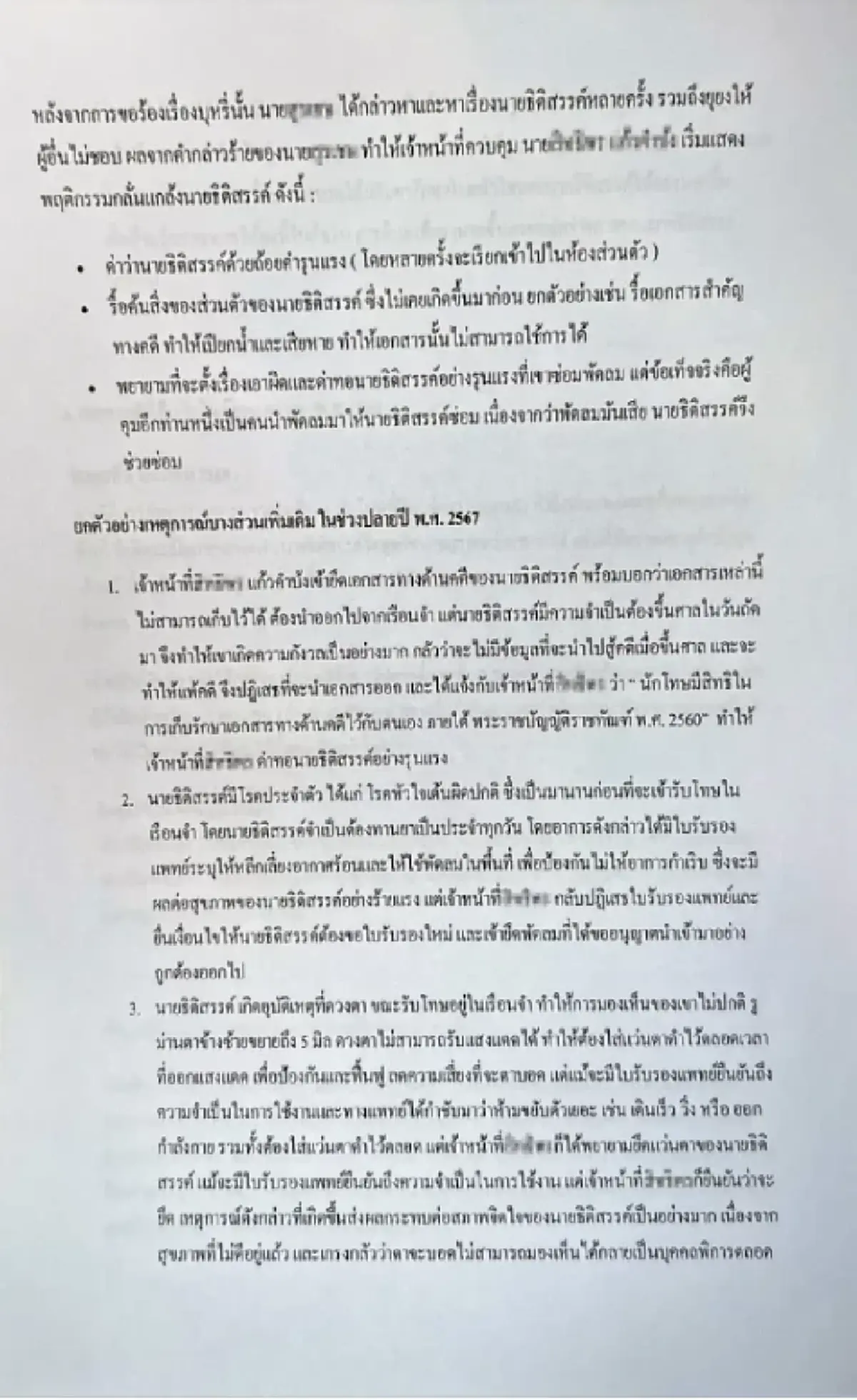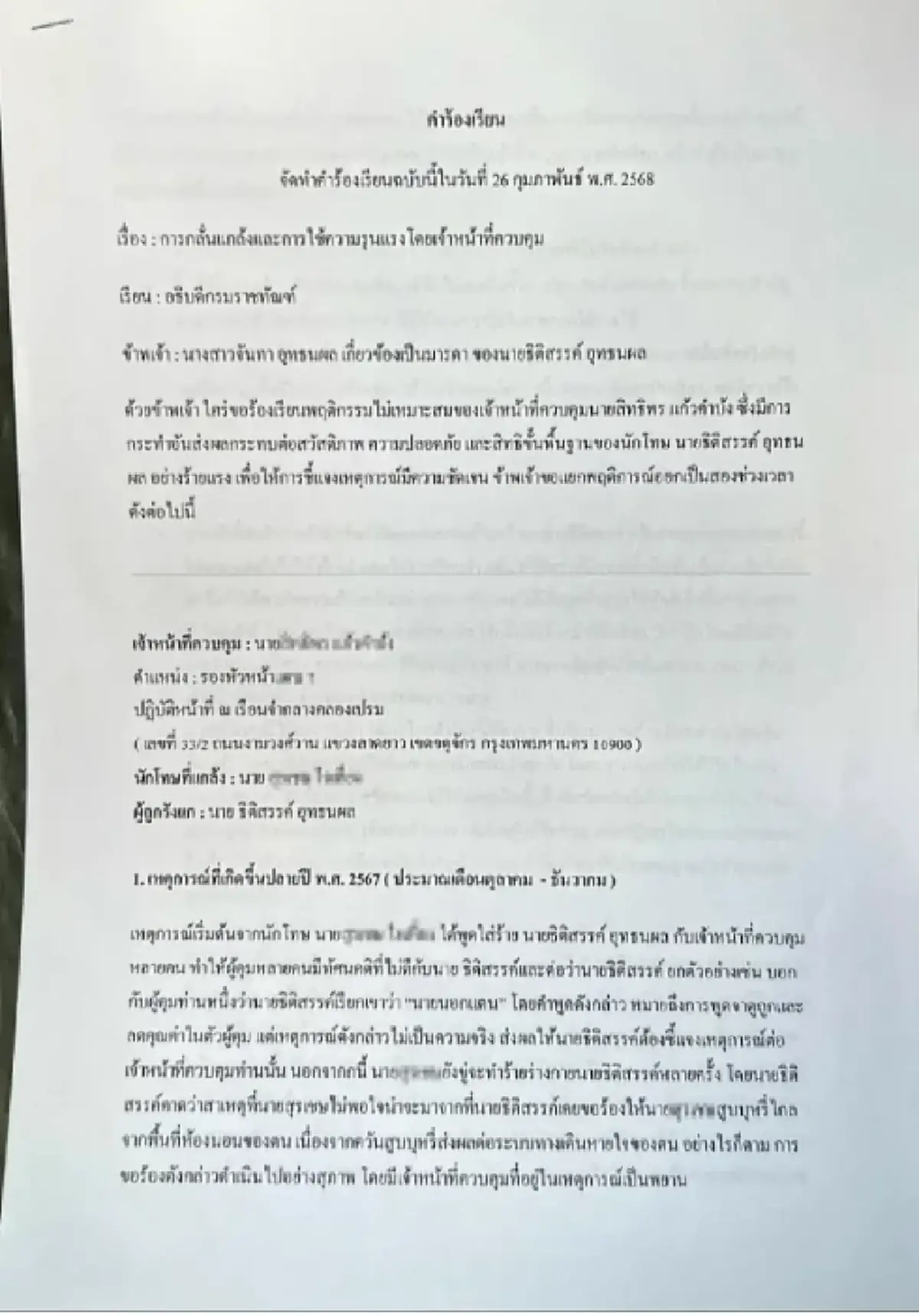 ด้วยข้าพเจ้าใคร่ขอร้องเรียนพฤติกรรมไม่เหมาะสมของเจ้าหน้าที่ควบคุมนายสิทธิพร แก้วคำบัง ซึ่งมีการกระทำอันส่งผลกระทบต่อสวัสดิภาพ ความปลอดภัย และสิทธิขั้นพื้นฐานของนักโทษ นายธิติสรรค์ อุทธนผล อย่างร้ายแรง เพื่อให้การชี้แจงเหตุการณ์มีความชัดเจน ข้าพเจ้าขอแยกพฤติการณ์ออกเป็นสองช่วงเวลาดังต่อไปนี้