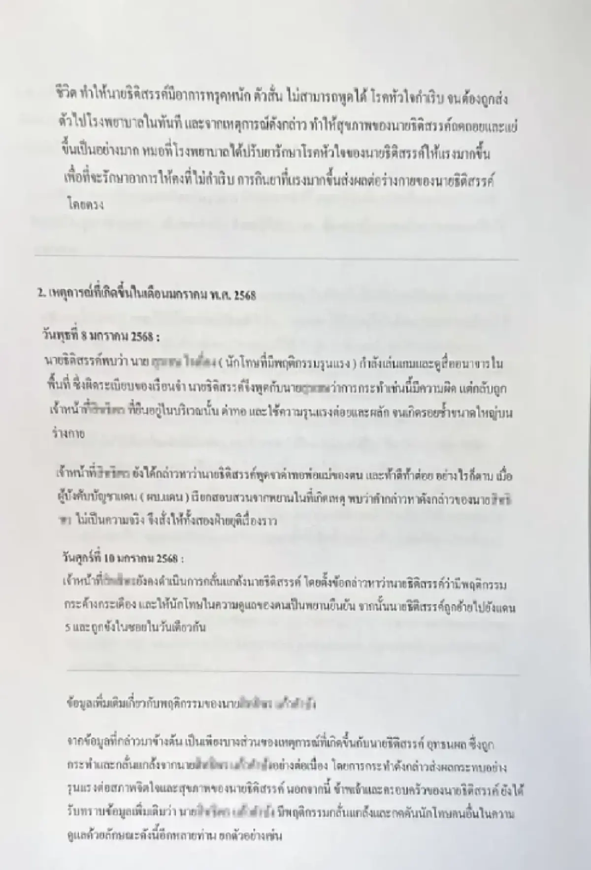 จากข้อมูลที่กล่าวมาข้างต้น เป็นเพียงบางส่วนของเหตุการณ์ที่เกิดขึ้นกับนายธิติสรรค์ อุทธนผล ซึ่งถูกกระทำและกลั่นแกล้งจากนาย… อย่างต่อเนื่อง โดยการกระทำดังกล่าวส่งผลกระทบอย่างรุนแรงต่อสภาพจิตใจและสุขภาพของนายธิติสรรค์ นอกจากนี้ ข้าพเจ้าและครอบครัวของนายธิติสรรค์ยังได้รับทราบข้อมูลเพิ่มเติมว่า นาย…มีพฤติกรรมกลั่นแกล้งและกดดันนักโทษคนอื่นในความดูแลด้วยลักษณะดังนี้อีกหลายท่าน ยกตัวอย่างเช่น