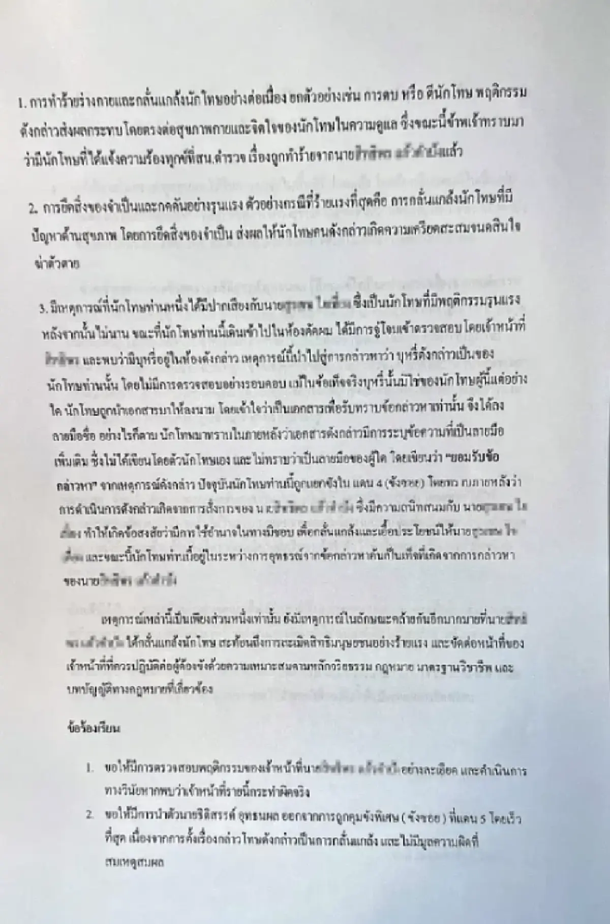 3. มีเหตุการณ์ที่นักโทษท่านหนึ่งได้มีปากเสียงกับนาย…ซึ่งเป็นนักโทษที่มีพฤติกรรมรุนแรง หลังจากนั้นไม่นาน ขณะที่นักโทษท่านนี้เดินเข้าไปในห้องตัดผม ได้มีการจู่โจมเข้าตรวจสอบโดยเจ้าหน้าที่… และพบว่ามีบุหรี่อยู่ในห้องดังกล่าว เหตุการณ์นี้นำไปสู่การกล่าวหาว่า บุหรี่ดังกล่าวเป็นของนักโทษท่านนั้น โดยไม่มีการตรวจสอบอย่างรอบคอบ แม้ในข้อเท็จจริงบุหรี่นั้นมิใช่ของนักโทษผู้นี้แต่อย่างใด นักโทษถูกนำเอกสารมาให้ลงนาม โดยเข้าใจว่าเป็นเอกสารเพื่อรับทราบข้อกล่าวหาเท่านั้น จึงได้ลงลายมือชื่อ อย่างไรก็ตาม นักโทษมาทราบในภายหลังว่าเอกสารดังกล่าวมีการระบุข้อความที่เป็นลายมือเพิ่มเติม ซึ่งไม่ได้เขียนโดยตัวนักโทษเอง และไม่ทราบว่าเป็นลายมือของผู้ใด โดยเขียนว่า “ยอมรับข้อกล่าวหา” จากเหตุการณ์ดังกล่าว ปัจจุบันนักโทษท่านนี้ถูกแยกขังใน แดน 4 (ขังซอย) โดยทราบในภายหลังว่าการดำเนินการดังกล่าวเกิดจากการสั่งการของ นาย… ซึ่งมีความสนิทสนมกับ นาย… ทำให้เกิดข้อสงสัยว่ามีการใช้อำนาจในทางมิชอบ เพื่อกลั่นแกล้งและเอื้อประโยชน์ให้นาย… และขณะนี้นักโทษท่านนี้อยู่ในระหว่างการอุทธรณ์จากข้อกล่าวหาอันเป็นเท็จที่เกิดจากการกล่าวหาของนาย…