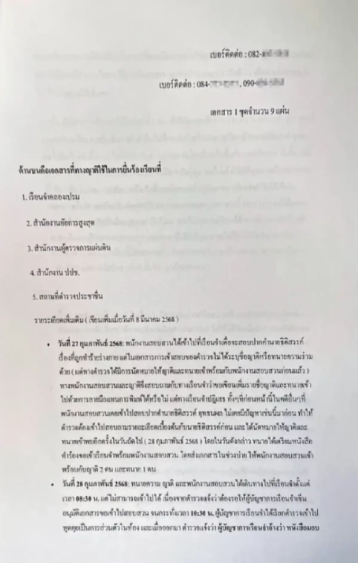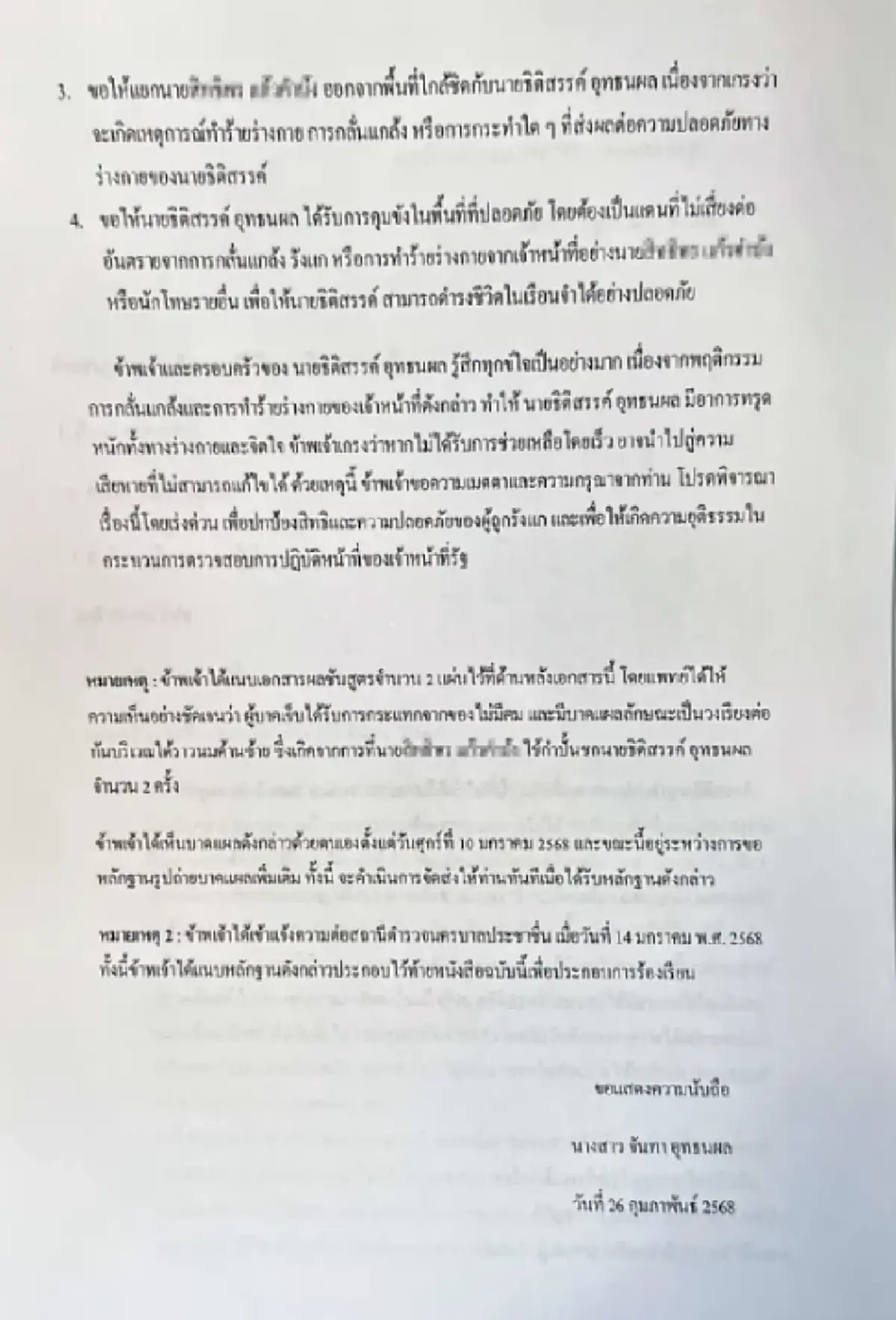 หมายเหตุ 2 : ข้าพเจ้าได้แจ้งความต่อสถานีตำรวจนครบาลประชาชื่น เมื่อวันที่ 14 มกราคม พ.ศ. 2568 ทั้งนี้ข้าพเจ้าได้แนบหลักฐานดังกล่าวประกอบไว้ท้ายหนังสือฉบับนี้เพื่อประกอบการร้องเรียน