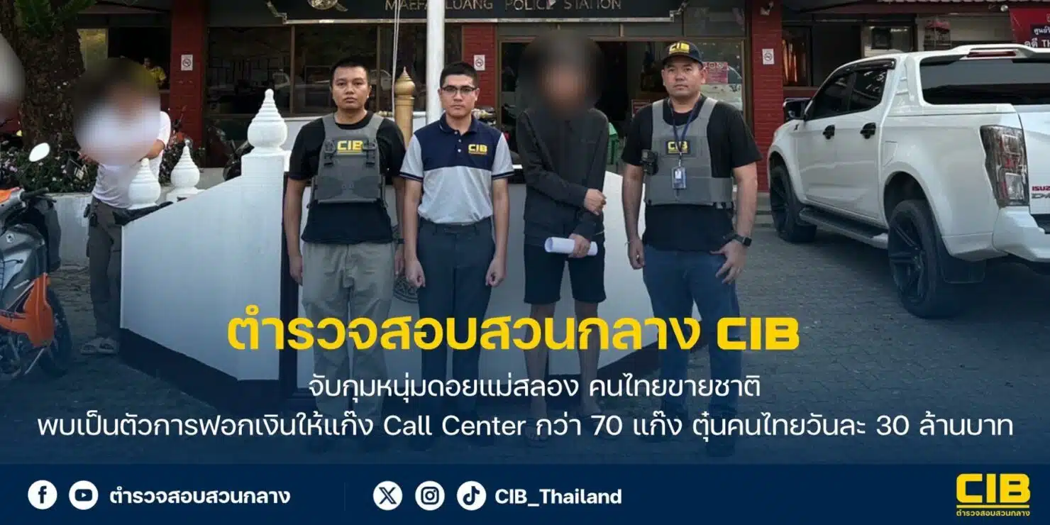 ตำรวจสอบสวนกลาง (CIB) รายงาน บุกจับนายบุรพล หนุ่มชาวไทยบนดอยแม่สลอง ฐานร่วมมือกับแก๊งคอลเซ็นเตอร์ ตุ๋นเงินคนไทยกว่า 70 แก๊ง ฟอกเงินมหาศาลกว่า 30 ล้านบาทต่อวัน