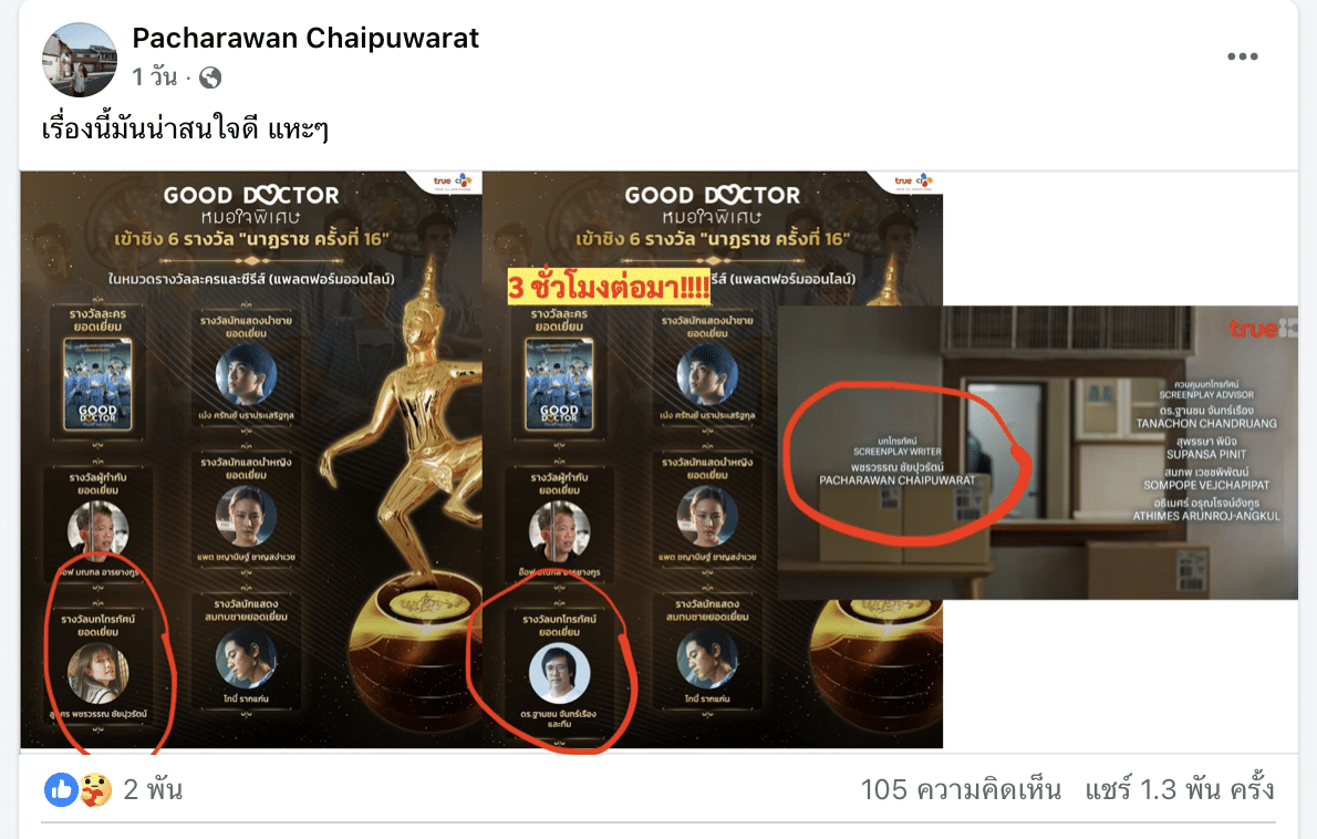 ดราม่าร้อนในวงการณ์โทรทัศน์ จากกรณี ลูกศร พชรวรรณ ชัยปุวรัตน์ คนเขียนบทซีรีส์ Good Doctor TH หมอใจพิเศษ ได้แชร์ภาพการประกาศผลผู้เข้าชิงรางวัลรางวัลนาฏราช ครั้งที่ 16 รอบสุดท้าย ในสาขาบทโทรทัศน์ยอดเยี่ยม ตอนแรกสุดมีชื่อของตนเองในฐานะคนเขียนบทเข้าชิง แต่ปรากฎว่าต่อมา ภาพอินโได้เปลี่ยนชื่อคนเข้าชิงรางวัลเป็นชื่อของ ดร.ฐานชนจันทร์เรือง และทีม ซึ่งเป็นผู้ควบคุมบทโทรทัศน์ เข้าชิงแทน