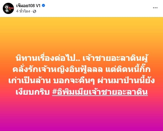 เหล่าขาเผือกชอบเม้าท์มารวมตัวกันตรงนี้ เพราะวงการบันเทิงมีนิทานเรื่องใหม่มาเสิร์ฟถึงที่กันแล้ว เมื่อเพจดังอย่าง เจ๊มอย108 V1 ได้ออกมาเปิดเผยตัวอย่างนิทานเรื่องใหม่ โดยมี เจ้าชายอะลาดิน เป็นตัวต้นเรื่อง โดยข้อความระบุว่า “นิทานเรื่องต่อไป.. เจ้าชายอะลาดินผู้คลั่งรักเจ้าหญิงอินฟู้ลลล แต่ติดหนี้กิ๊กเก่าเป็นล้าน บอกจะคืนๆ ผ่านมาป่านนี้ยังเงียบกริบ #อิพิมเมียเจ้าชายอะลาดิน”