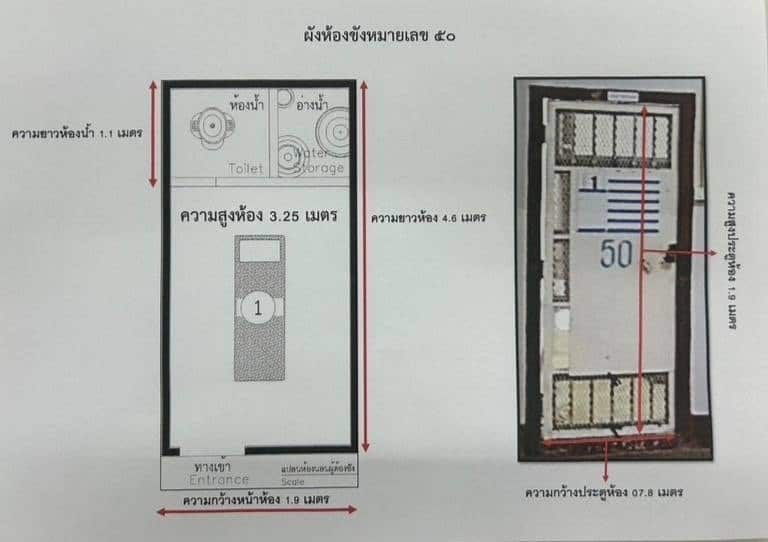 ส่วนห้องที่อดีตผู้กำกับโจ้ ใช้ผ้าผูกคอเสียชีวิต พบว่าอยู่ห้องหมายเลข 50 ขนาดความสูงของห้อง 3.25 เมตร ด้านหน้าห้องกว้าง 1.9 เมตร ความยาวห้อง 4.6 เมตร ห้องน้ำกว้าง 1.1 เมตร
