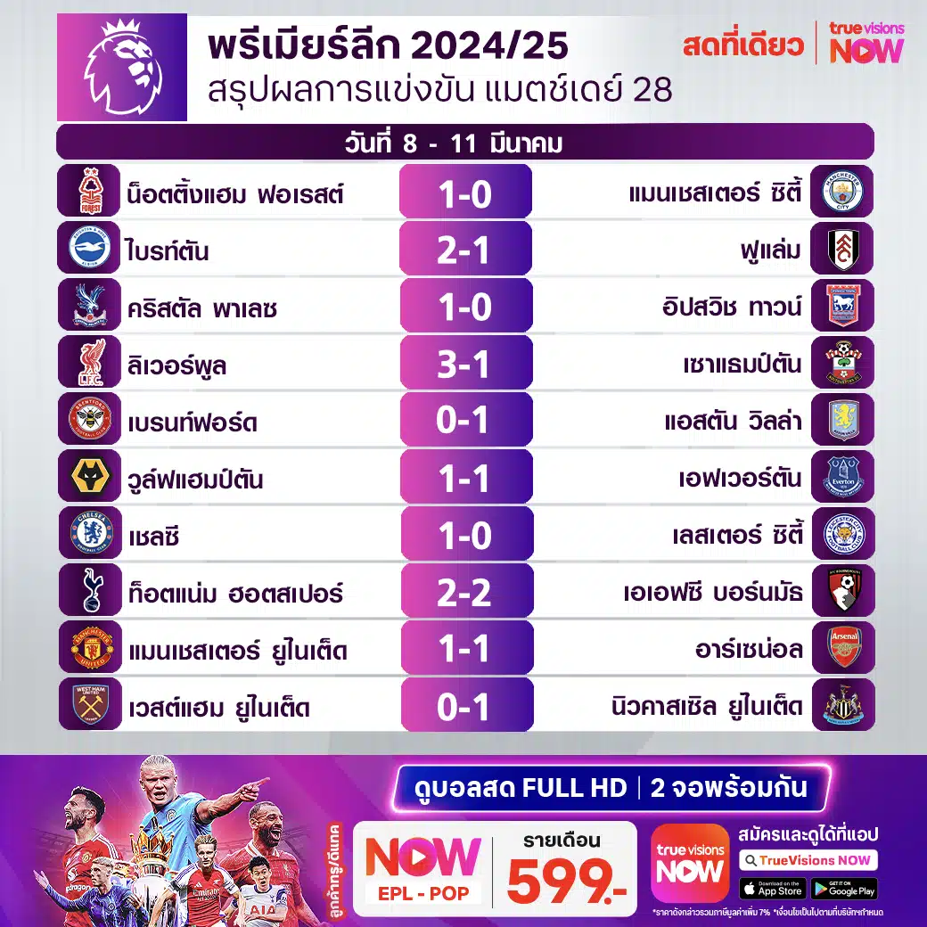 สรุปผลการแข่งขัน พรีเมียร์ลีก อังกฤษ 2024/25 หลังจบนัดที่ 28