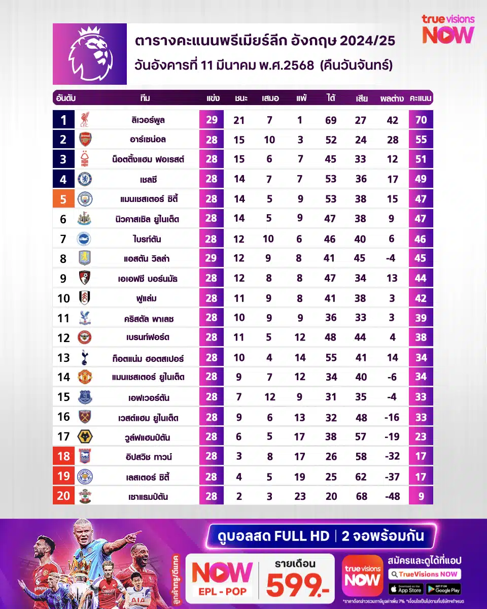 >> ตารางคะแนนพรีเมียร์ลีก 2024/25 อัปเดตล่าสุด เช็คคะแนนทุกทีมสดๆได้ที่นี่ <<