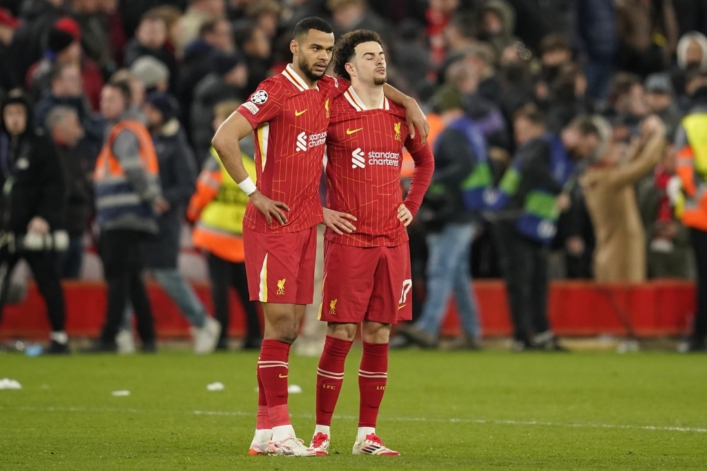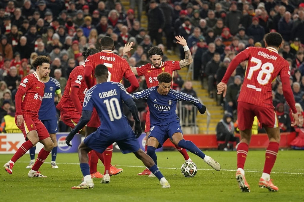 Liverpool’s Ryan Gravenberch, left, battles for the ball with PSG’s Fabian Ruiz during the Champions League round of 16 second leg soccer match between Liverpool and Paris Saint-Germain at Anfield in Liverpool, England, Tuesday, March 11, 2025. (AP Photo/Dave Thompson)PSG’s goalkeeper Gianluigi Donnarumma reacts during penalty shoot out during the Champions League round of 16 second leg soccer match between Liverpool and Paris Saint-Germain at Anfield in Liverpool, England, Tuesday, March 11, 2025. (AP Photo/Jon Super)Liverpool’s Curtis Jones, right, and Cody Gakpo lost a penalty shootout at the end of the Champions League round of 16 second leg soccer match between Liverpool and Paris Saint-Germain at Anfield in Liverpool, England, Tuesday, March 11, 2025. (AP Photo/Dave Thompson)Liverpool’s Virgil van Dijk, left, and PSG’s Lee Kang-in battle for the ball during the Champions League round of 16 second leg soccer match between Liverpool and Paris Saint-Germain at Anfield in Liverpool, England, Tuesday, March 11, 2025. (AP Photo/Dave Thompson)PSG’s Desire Doue goes close with a shot during the Champions League round of 16 second leg soccer match between Liverpool and Paris Saint-Germain at Anfield in Liverpool, England, Tuesday, March 11, 2025. (AP Photo/Dave Thompson)Liverpool players stand dejected during penalty shootout during the Champions League round of 16 second leg soccer match between Liverpool and Paris Saint-Germain at Anfield in Liverpool, England, Tuesday, March 11, 2025. (AP Photo/Jon Super)