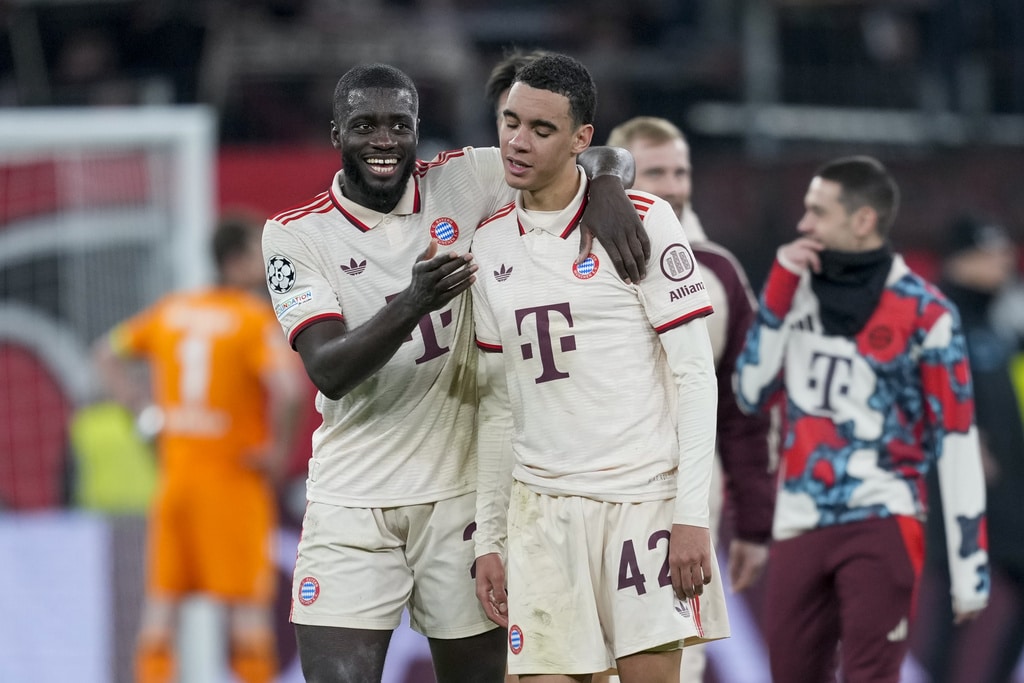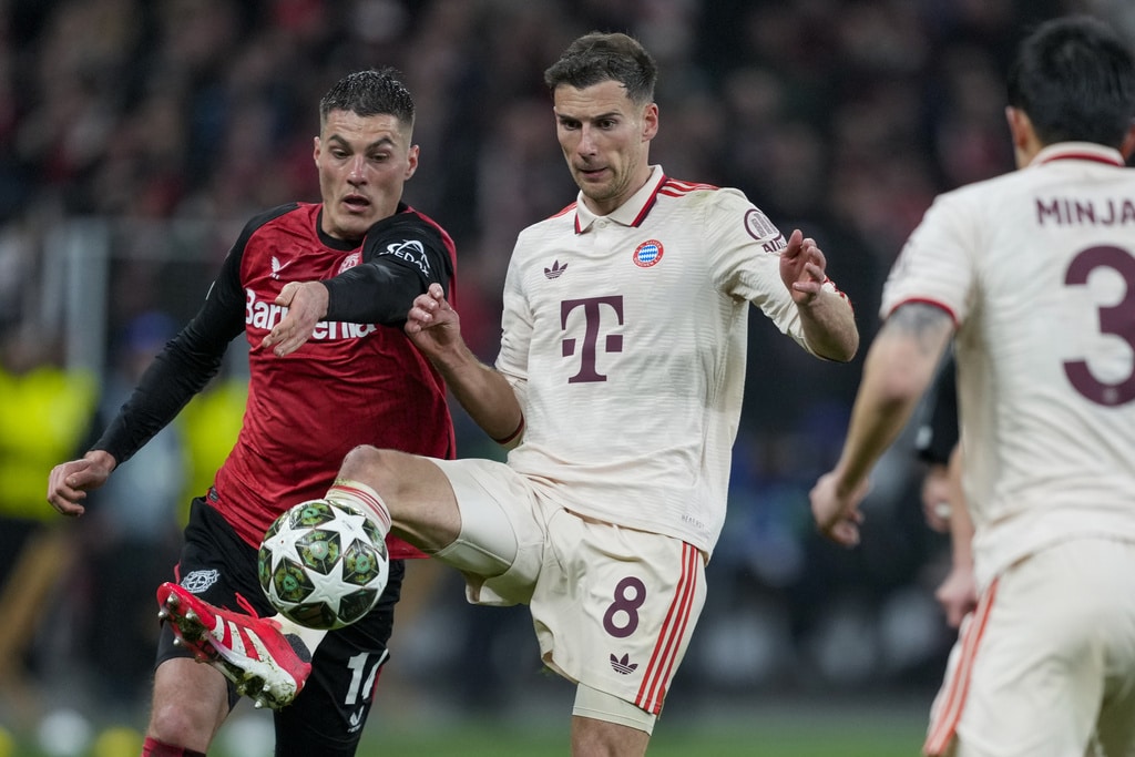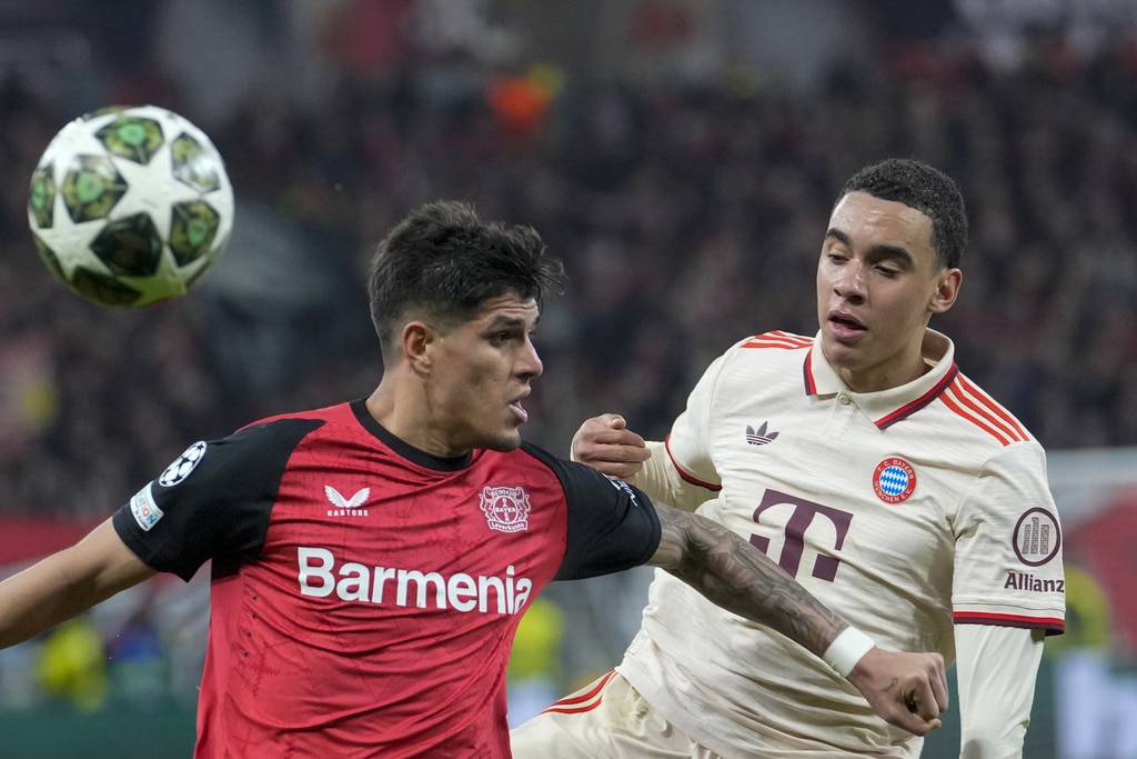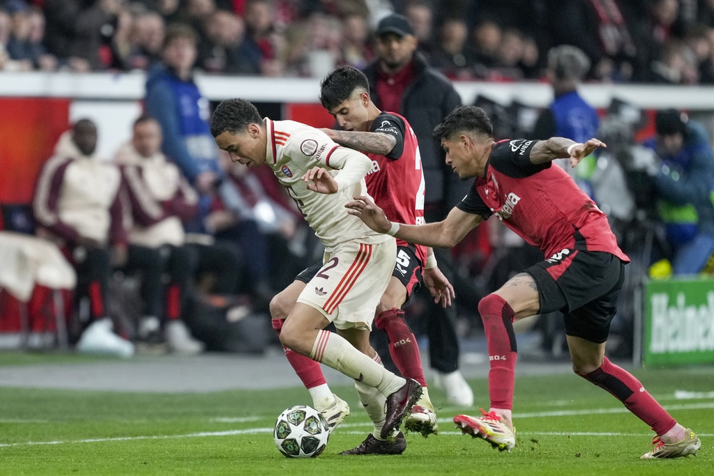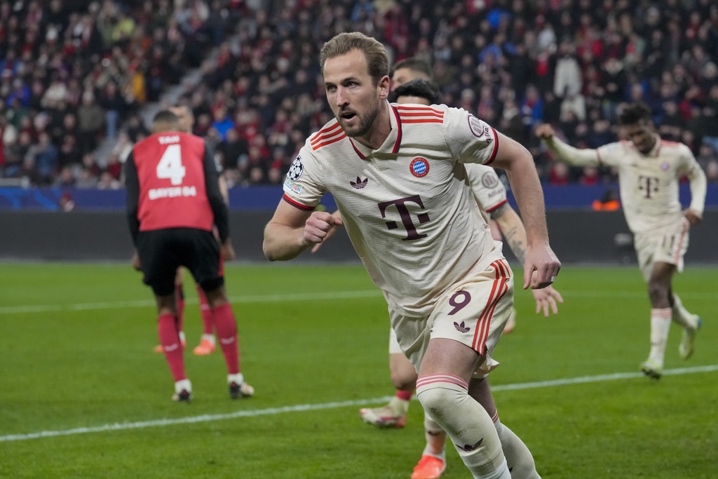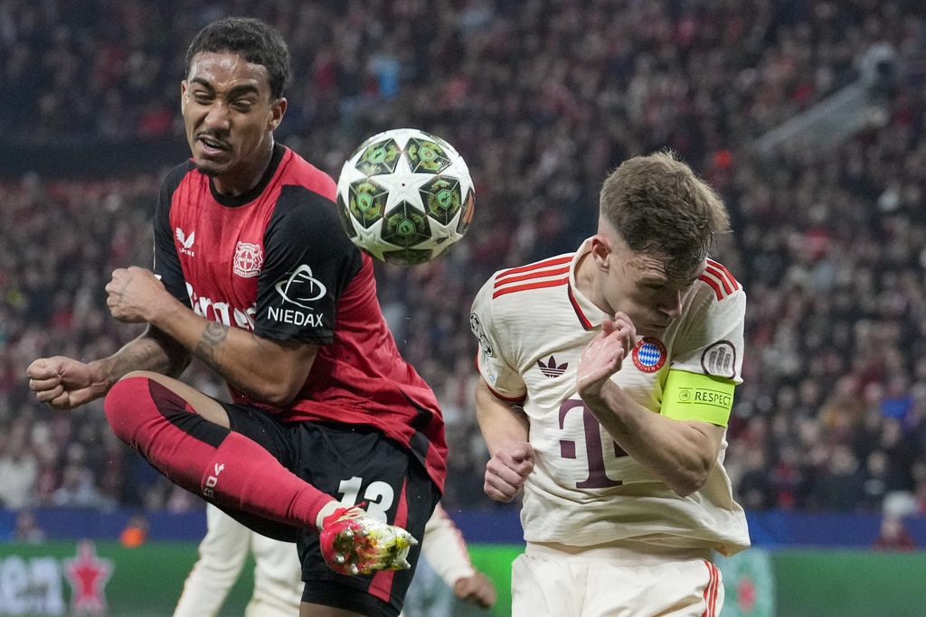 Leverkusen’s Arthur, left, duels for the ball with Bayern’s Joshua Kimmich during the Champions League round of 16 second leg soccer match between Bayer Leverkusen and Bayern Munich at the BayArena in Leverkusen, Germany, Tuesday, March 11, 2025. (AP Photo/Martin Meissner)Bayern’s Leon Goretzka, center, duels for the ball with Leverkusen’s Patrik Schick, left, during the Champions League round of 16 second leg soccer match between Bayer Leverkusen and Bayern Munich at the BayArena in Leverkusen, Germany, Tuesday, March 11, 2025. (AP Photo/Martin Meissner)Bayern’s Harry Kane celebrates after scoring the opening goal during the Champions League round of 16 second leg soccer match between Bayer Leverkusen and Bayern Munich at the BayArena in Leverkusen, Germany, Tuesday, March 11, 2025. (AP Photo/Martin Meissner)Bayern’s Jamal Musiala, left, duels for the ball with Leverkusen’s Exequiel Palacios, center, and Leverkusen’s Piero Hincapie during the Champions League round of 16 second leg soccer match between Bayer Leverkusen and Bayern Munich at the BayArena in Leverkusen, Germany, Tuesday, March 11, 2025. (AP Photo/Martin Meissner)Bayern’s Alphonso Davies celebrates after scoring his side’s second goal during the Champions League round of 16 second leg soccer match between Bayer Leverkusen and Bayern Munich at the BayArena in Leverkusen, Germany, Tuesday, March 11, 2025. (Rolf Vennenbernd/dpa via AP)Leverkusen’s Piero Hincapie, left, duels for the ball with Bayern’s Jamal Musiala during the Champions League round of 16 second leg soccer match between Bayer Leverkusen and Bayern Munich at the BayArena in Leverkusen, Germany, Tuesday, March 11, 2025. (AP Photo/Martin Meissner)Bayern’s Dayot Upamecano, left, and Bayern’s Jamal Musiala celebrate at the end of the Champions League round of 16 second leg soccer match between Bayer Leverkusen and Bayern Munich at the BayArena in Leverkusen, Germany, Tuesday, March 11, 2025. (AP Photo/Martin Meissner)