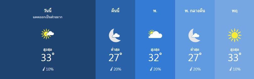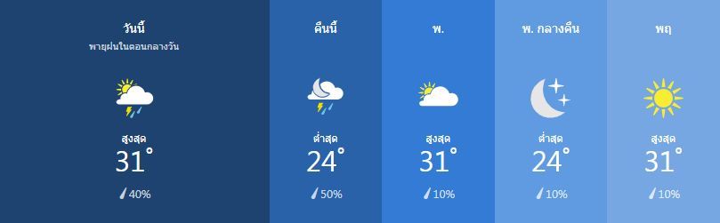 มีฝนฟ้าคะนองก่อตัวในตอนบ่าย สูง 31เซลเซียส ความเร็วลม ตะวันออกเฉียงใต้ ที่ 10 ถึง 15 กิโลเมตรต่อชั่วโมง โอกาสที่ฝนจะตก 40%